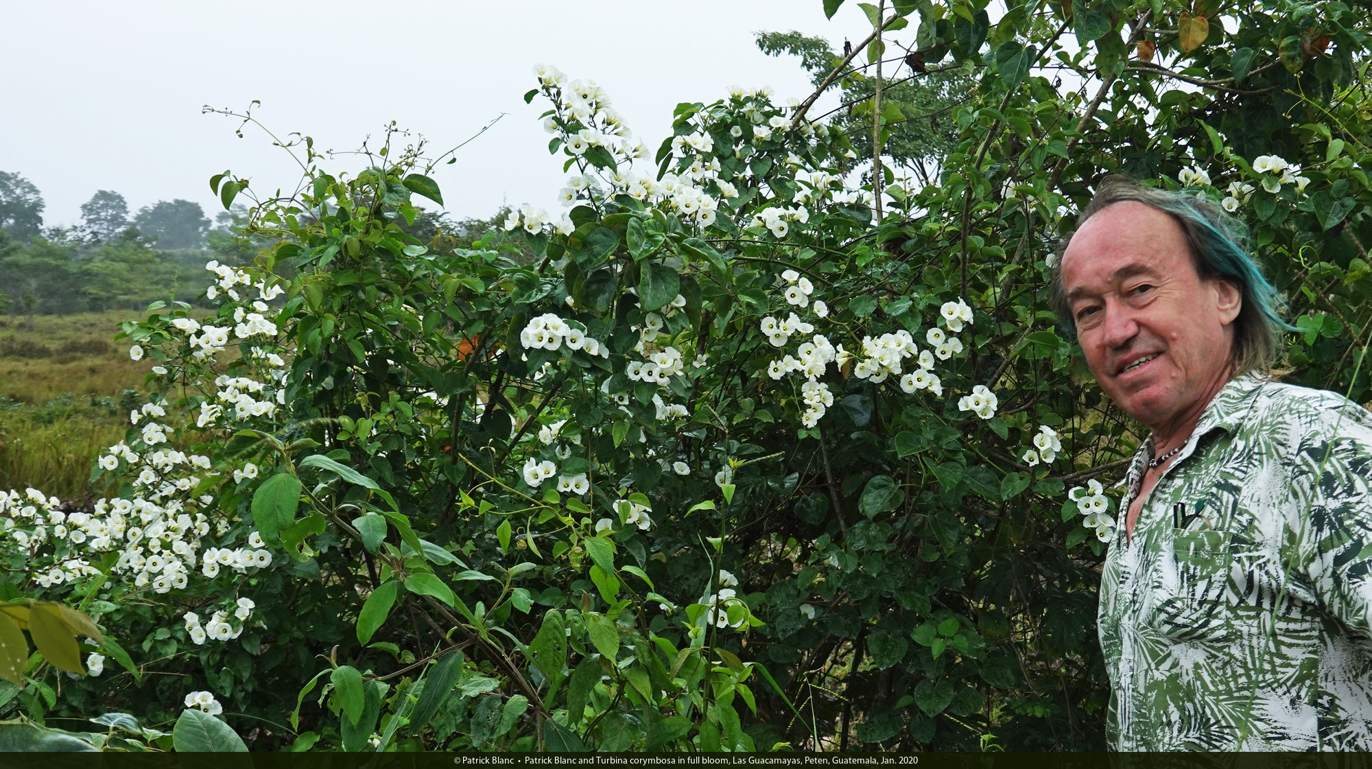 Patrick Blanc and Turbina corymbosa in full bloom, Las Guacamayas, Peten, Guatemala, Jan. 2020
