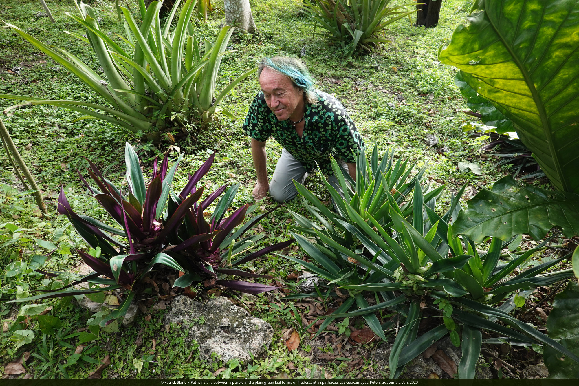 Patrick Blanc between a purple and a plain green leaf forms of Tradescantia spathacea, Las Guacamayas, Peten, Guatemala, Jan. 2020