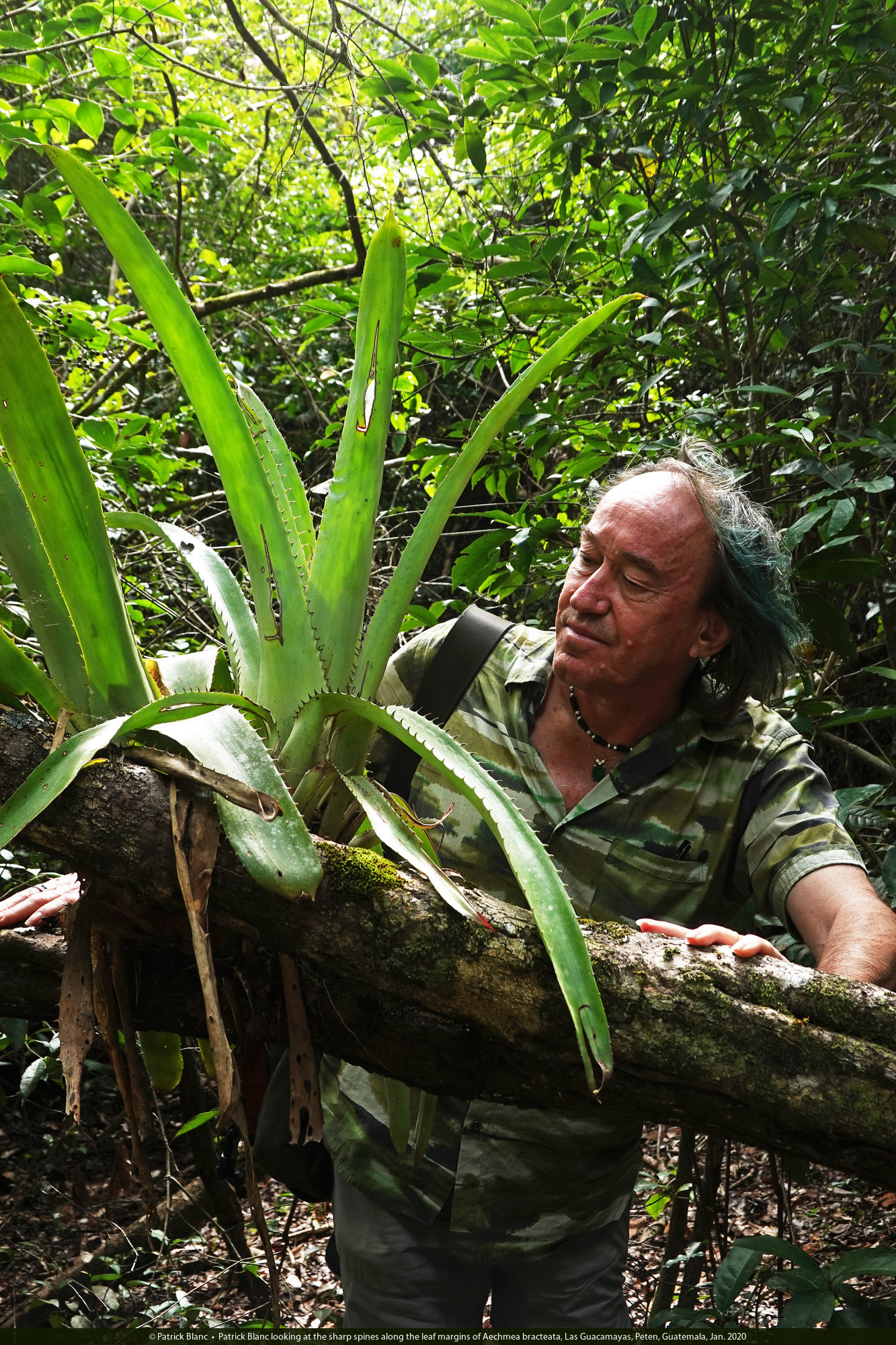 Patrick Blanc looking at the sharp spines along the leaf margins of Aechmea bracteata, Las Guacamayas, Peten, Guatemala, Jan. 2020
