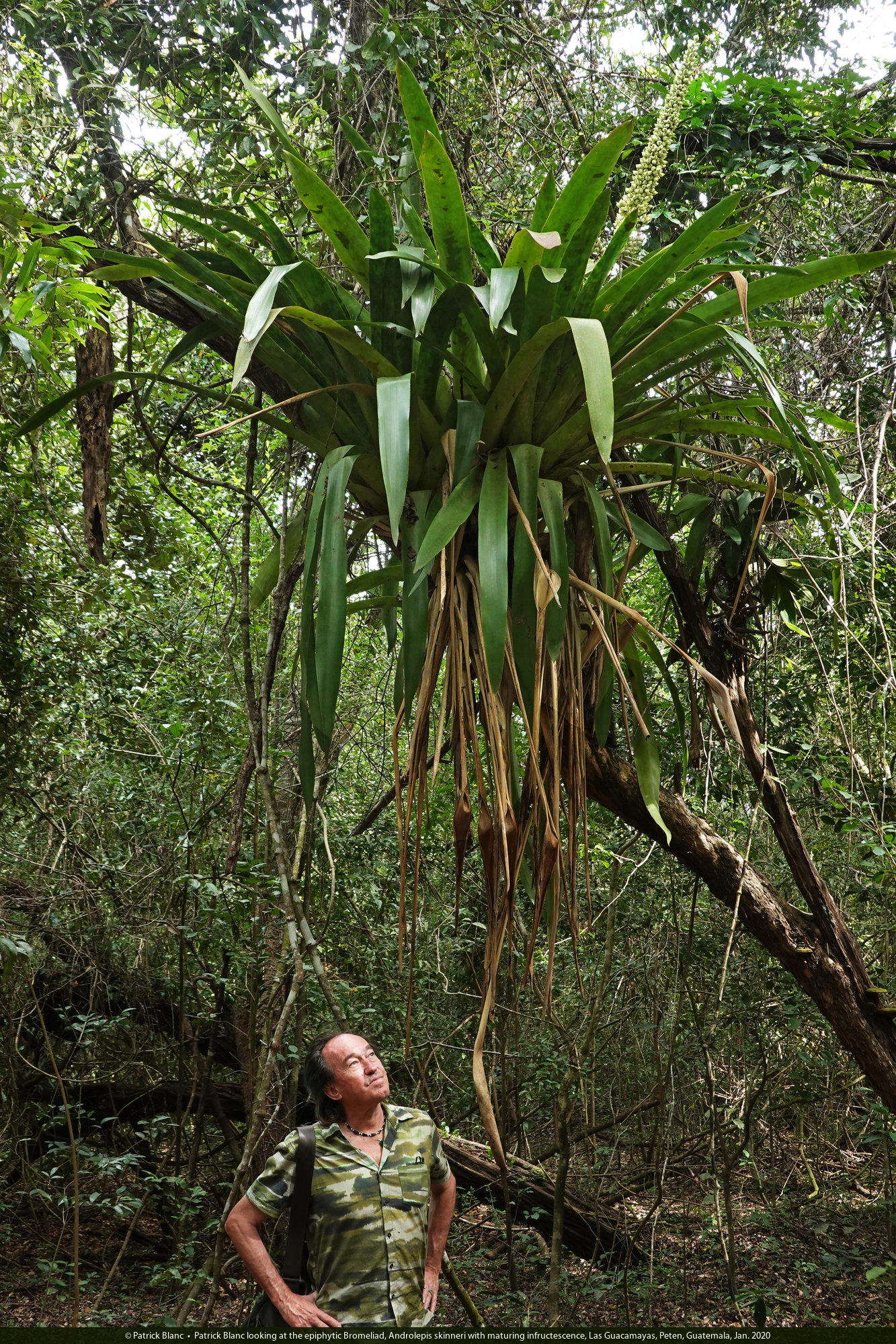 Patrick Blanc looking at the epiphytic Bromeliad, Androlepis skinneri with maturing infructescence, Las Guacamayas, Peten, Guatemala, Jan. 2020