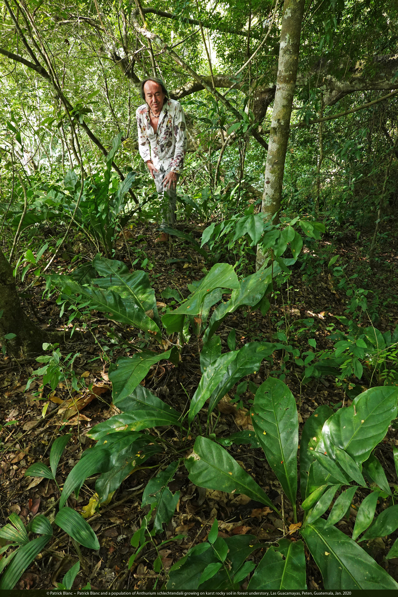 Patrick Blanc and a population of Anthurium schlechtendalii growing on karst rocky soil in forest understory, Las Guacamayas, Peten, Guatemala, Jan. 2020