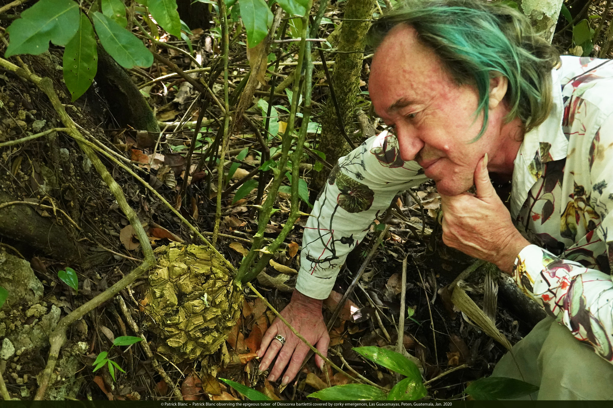 Patrick Blanc observing the epigeous tuber of Dioscorea bartlettii covered by corky emergences, Las Guacamayas, Peten, Guatemala, Jan. 2020