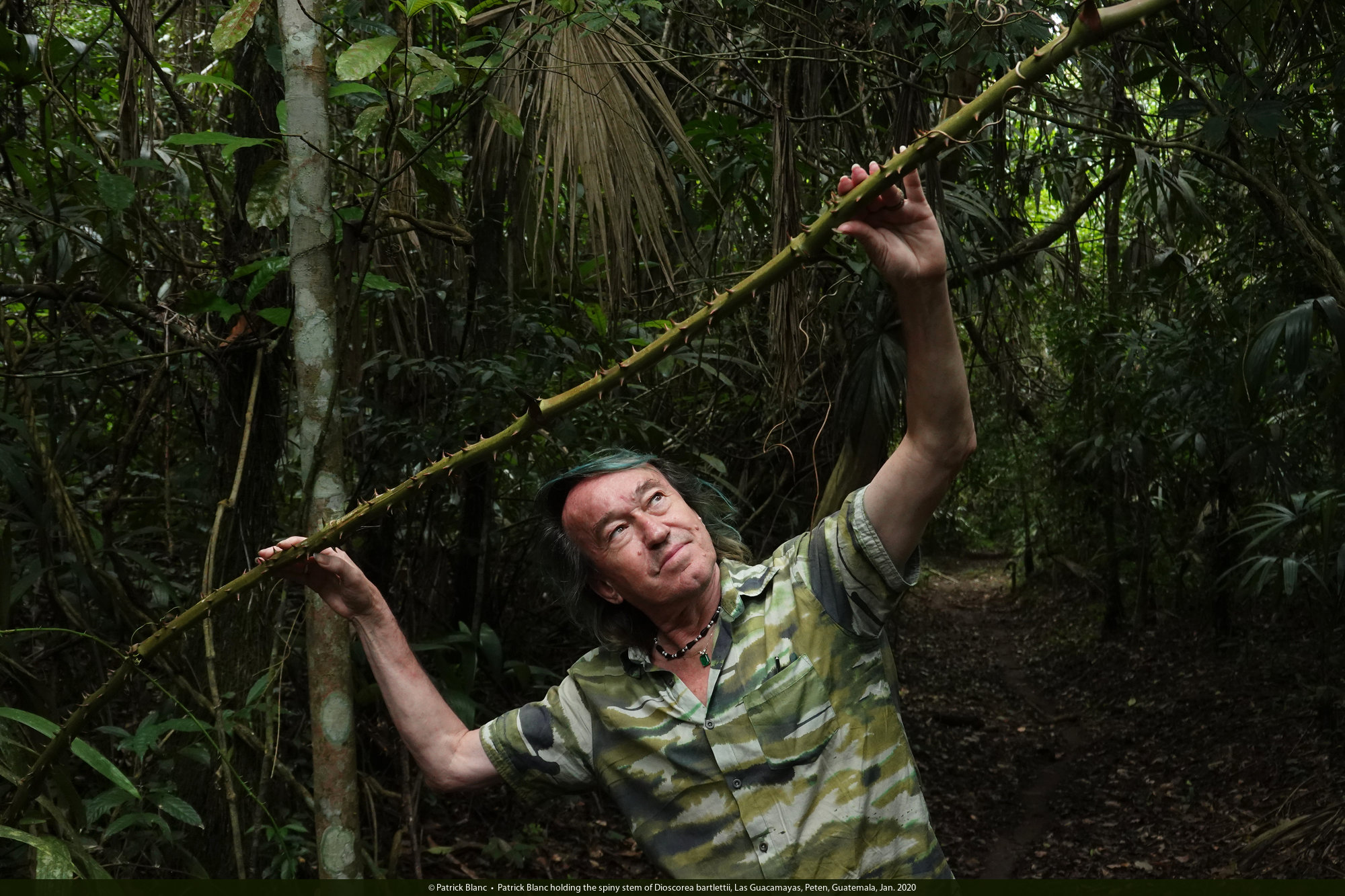 Patrick Blanc holding the spiny stem of Dioscorea bartlettii, Las Guacamayas, Peten, Guatemala, Jan. 2020