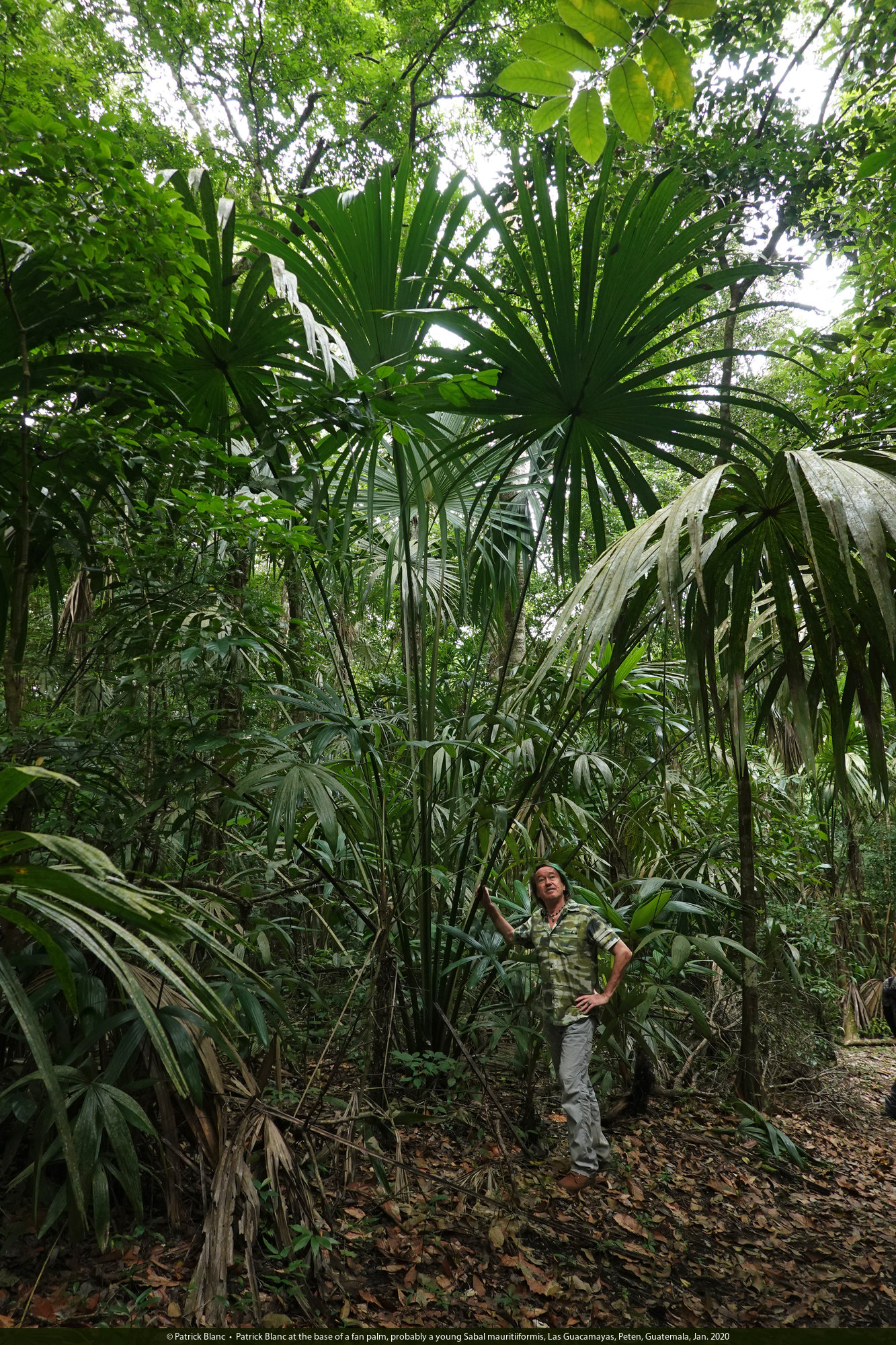 Patrick Blanc at the base of a fan palm, probably a young Sabal mauritiiformis, Las Guacamayas, Peten, Guatemala, Jan. 2020