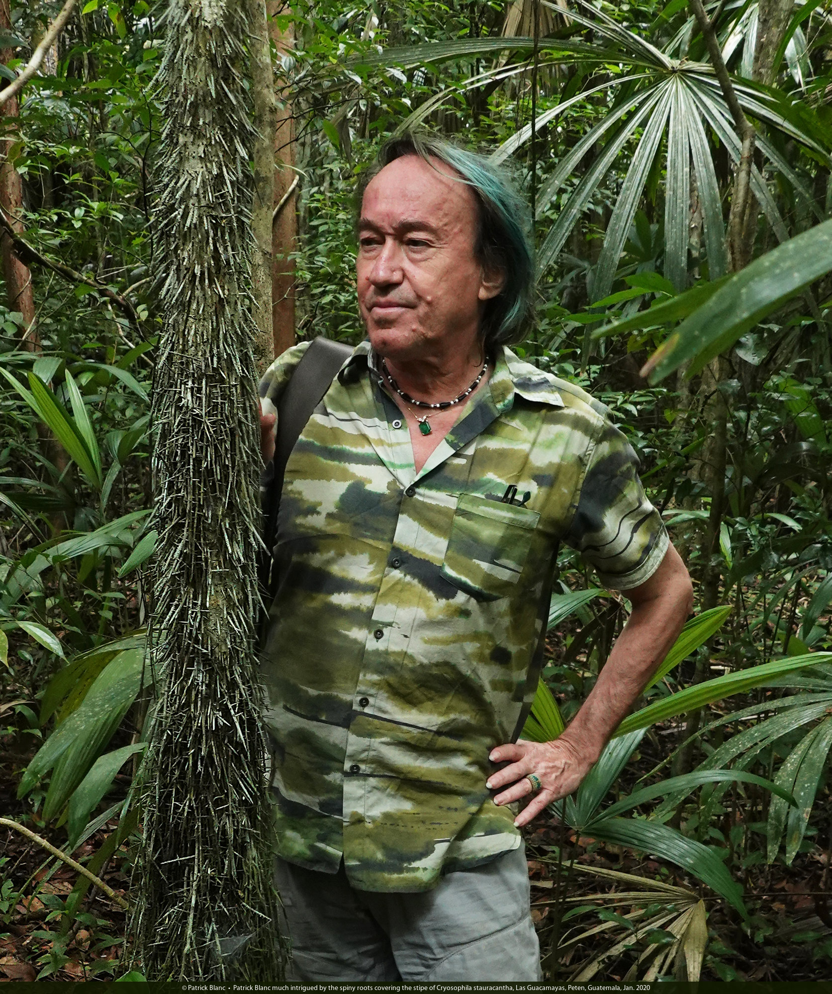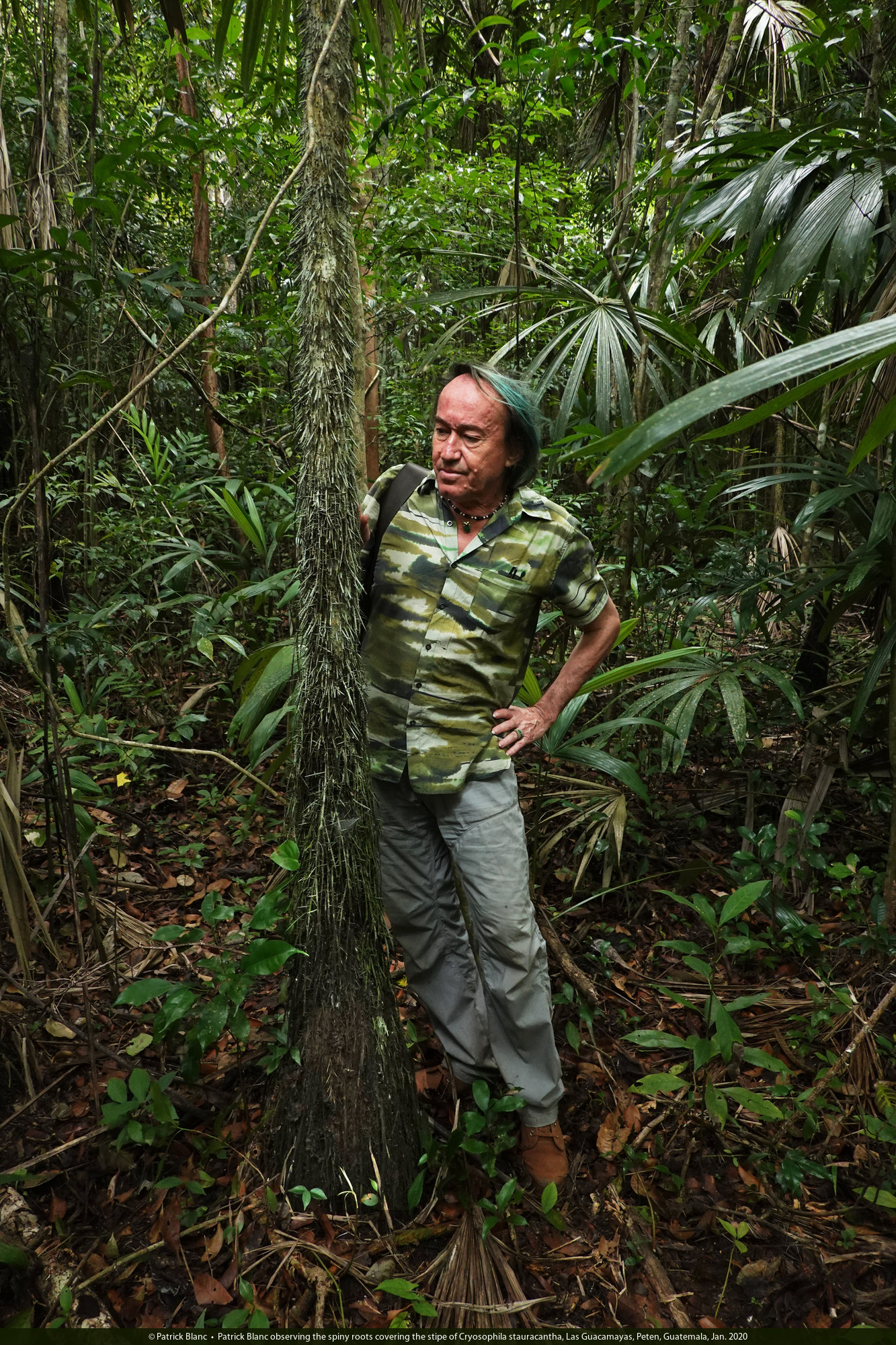 Patrick Blanc much intrigued by the spiny roots covering the stipe of Cryosophila stauracantha, Las Guacamayas, Peten, Guatemala, Jan. 2020