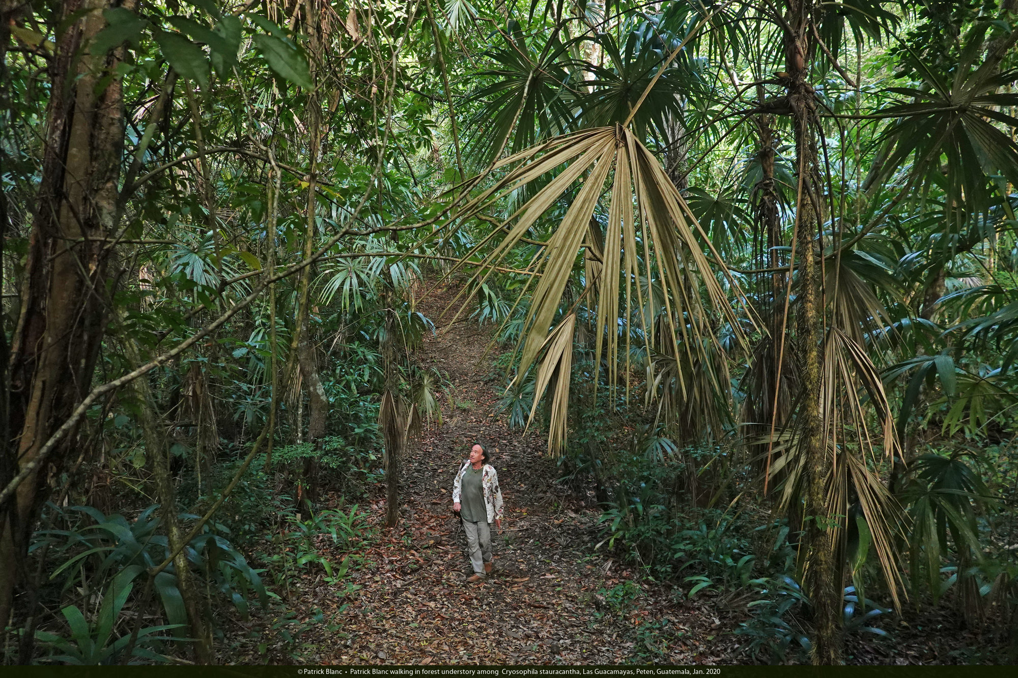Patrick Blanc walking in forest understory among Cryosophila stauracantha, Las Guacamayas, Peten, Guatemala, Jan. 2020