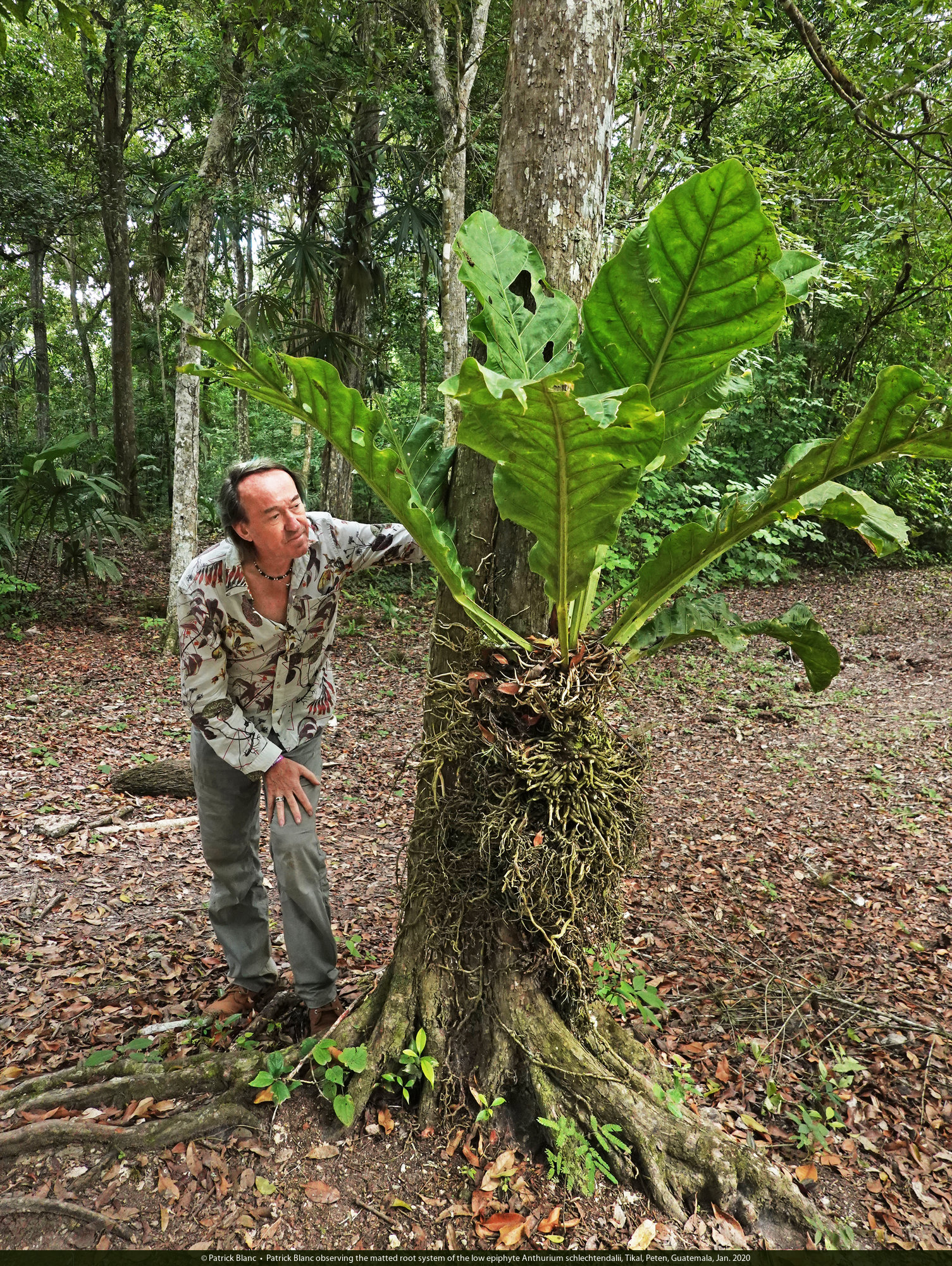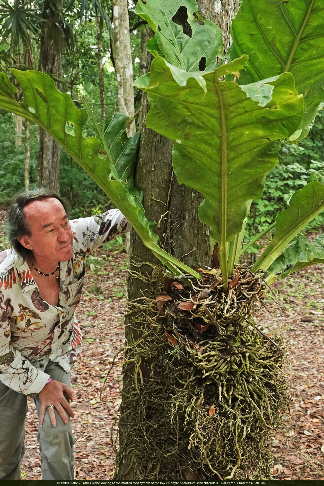Patrick Blanc observing the matted root system of the low epiphyte Anthurium schlechtendalii, Tikal, Peten, Guatemala, Jan. 2020