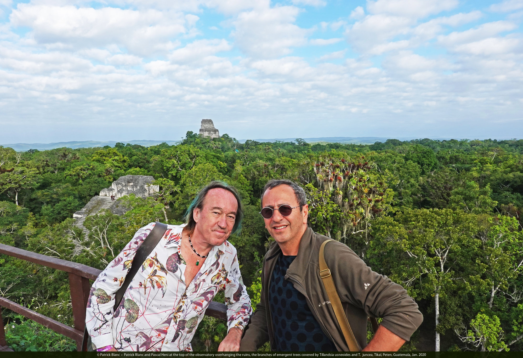 Patrick Blanc and Pascal Heni at the top of the observatory overhanging the ruins, the branches of emergent trees covered by Tillandsia usneoides and T. juncea, Tikal, Peten, Guatemala, Jan. 2020