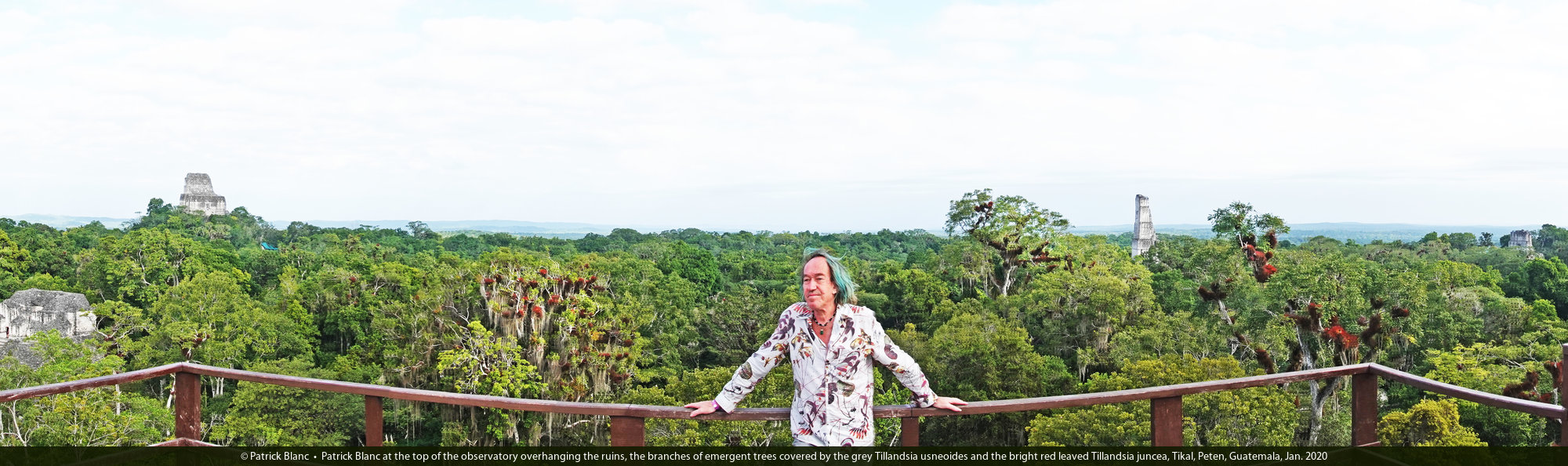 Patrick Blanc at the top of the observatory overhanging the ruins, the branches of emergent trees covered by the grey Tillandsia usneoides and the bright red leaved Tillandsia juncea, Tikal, Peten, Guatemala, Jan. 2020