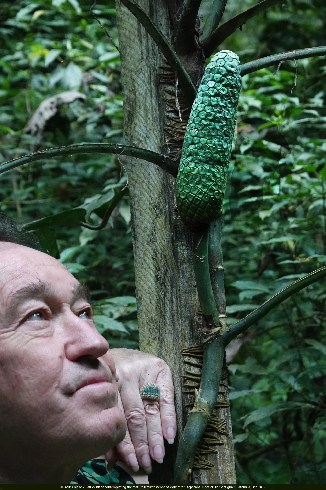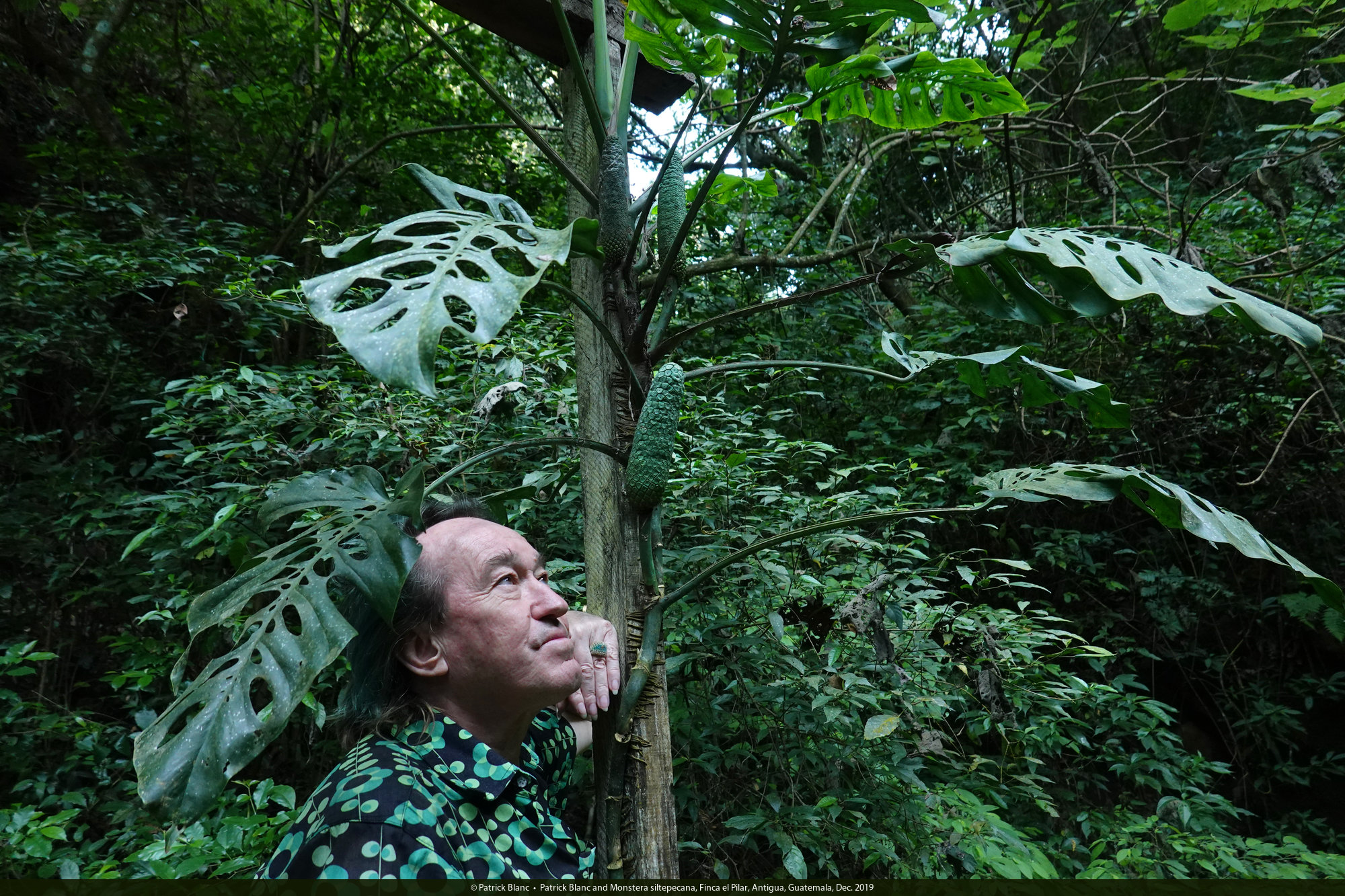 Patrick Blanc contemplating the mature infructescence of Monstera siltepecana, Finca el Pilar, Antigua, Guatemala, Dec. 2019