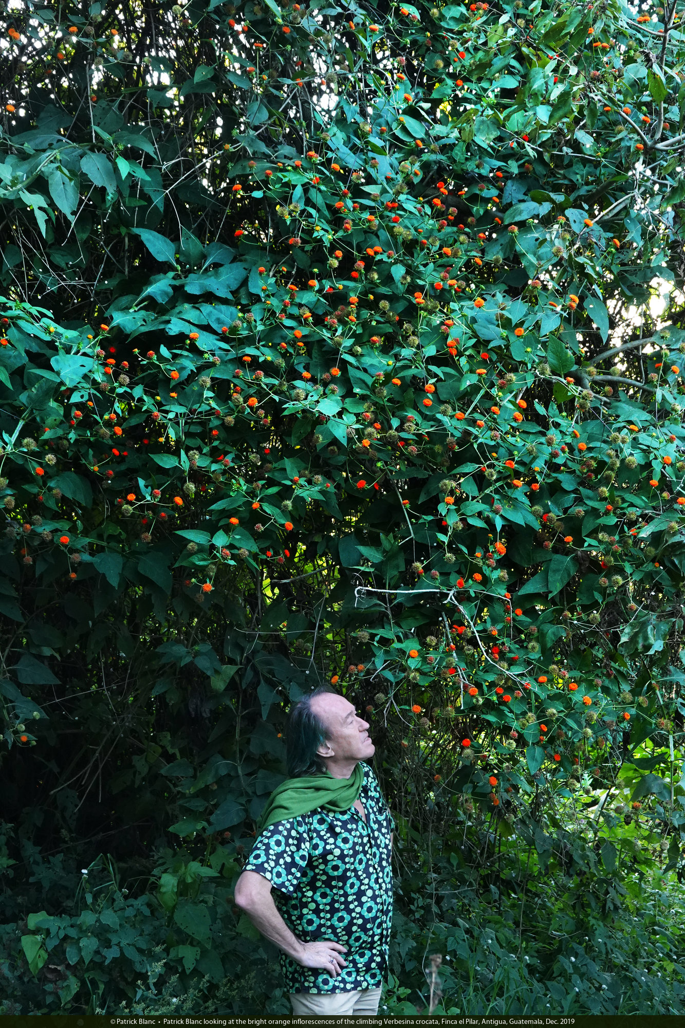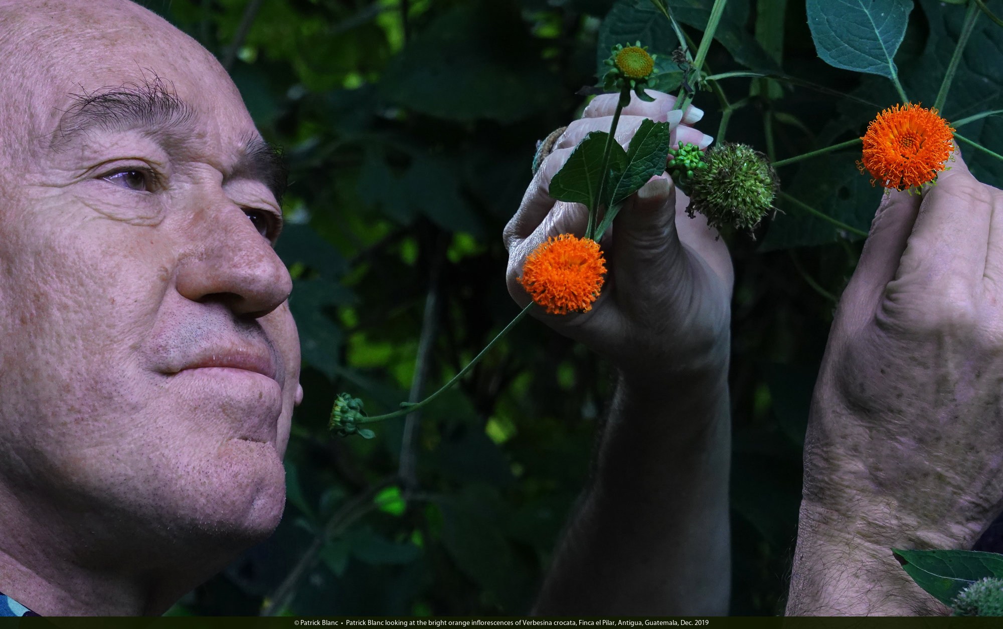 Patrick Blanc looking at the bright orange inflorescences of Verbesina crocata, Finca el Pilar, Antigua, Guatemala, Dec. 2019