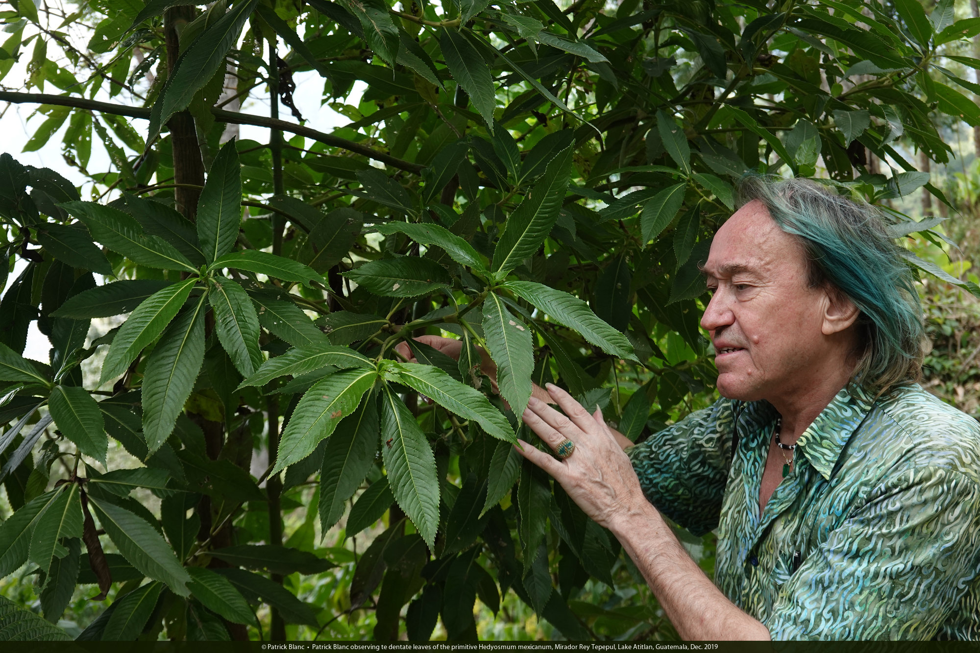 Patrick Blanc observing te dentate leaves of the primitive Hedyosmum mexicanum, Mirador Rey Tepepul, Lake Atitlan, Guatemala, Dec. 2019