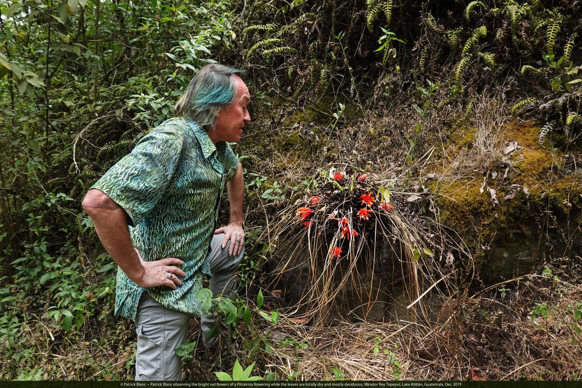 Patrick Blanc observing the bright red flowers of Pitcairnia heterophylla flowering while the leaves are totally dry and deciduous, Mirador Rey Tepepul, Lake Atitlan, Guatemala, Dec. 2019