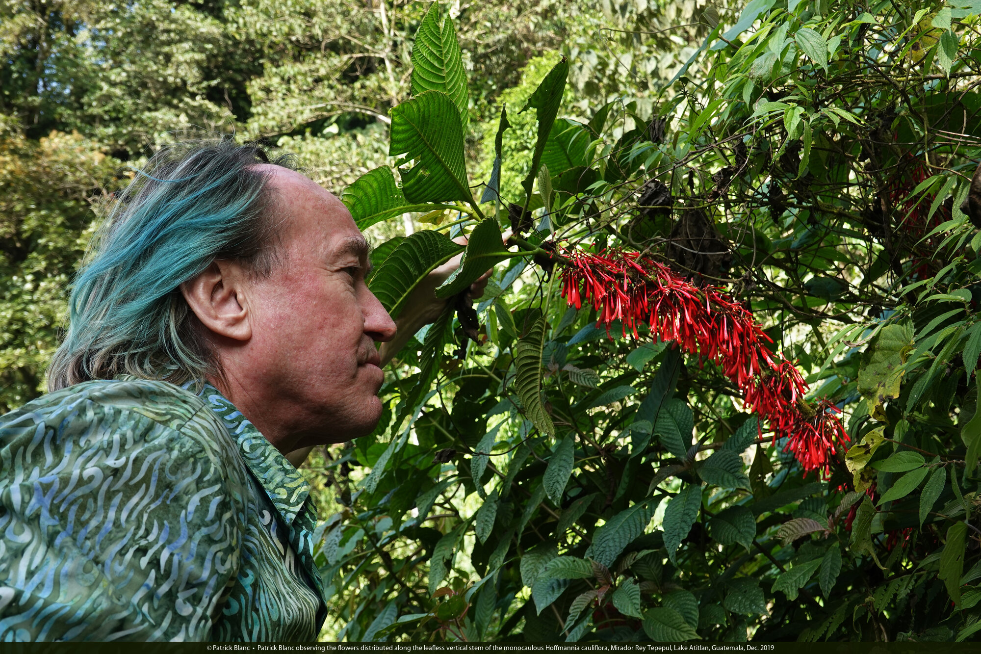 Patrick Blanc observing the flowers distributed along the leafless vertical stem of the monocaulous Hoffmannia cauliflora, Mirador Rey Tepepul, Lake Atitlan, Guatemala, Dec. 2019