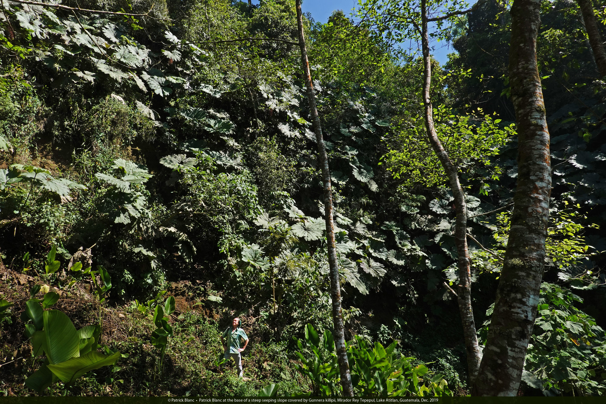 Patrick Blanc at the base of a steep seeping slope covered by Gunnera killipiana, Mirador Rey Tepepul, Lake Atitlan, Guatemala, Dec. 2019