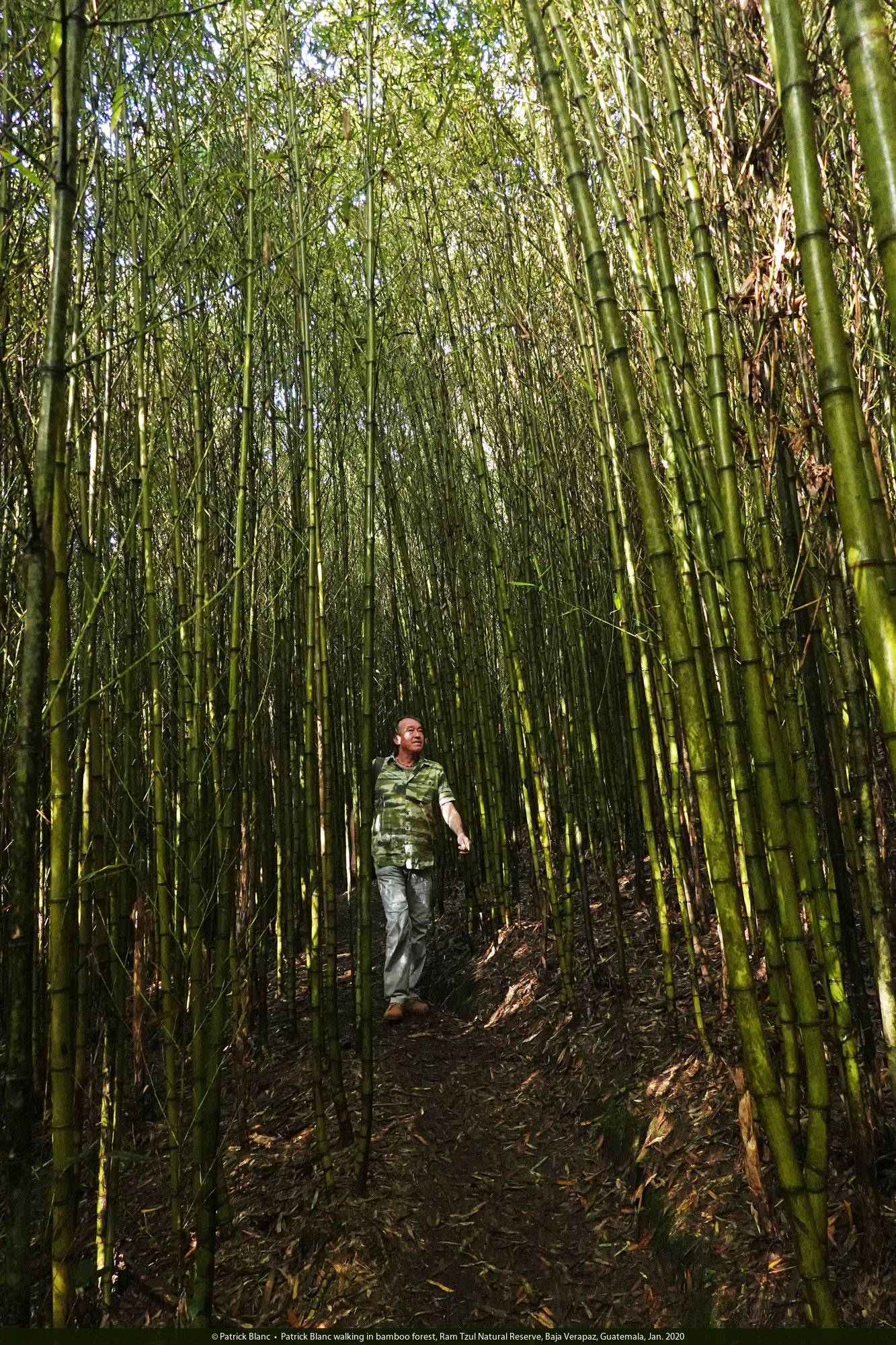Patrick Blanc walking in bamboo forest, Ram Tzul Natural Reserve, Baja Verapaz, Guatemala, Jan. 2020