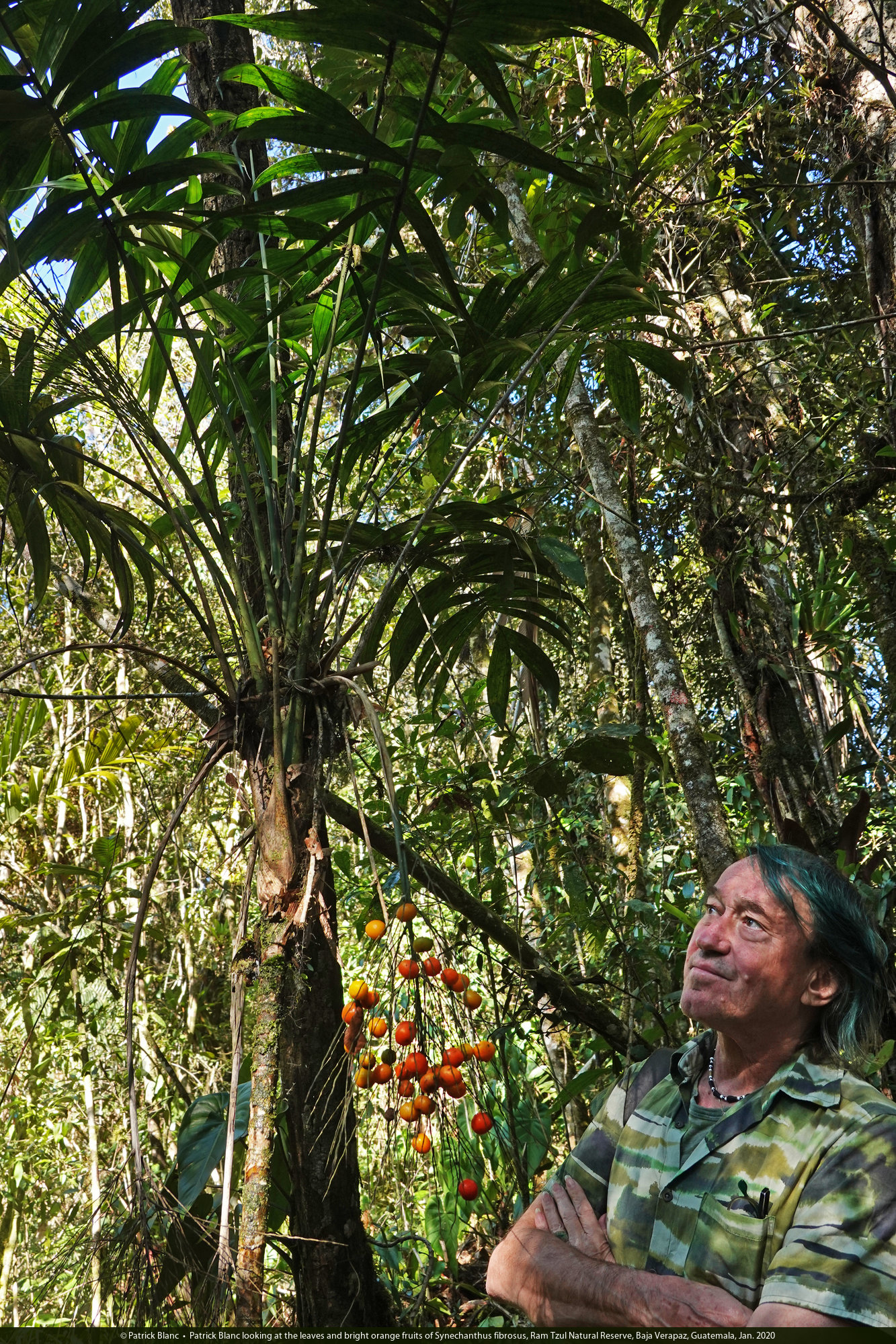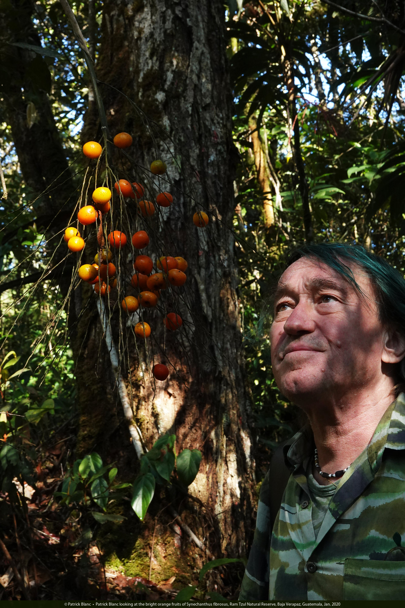 Patrick Blanc looking at the bright orange fruits of Synechanthus fibrosus, Ram Tzul Natural Reserve, Baja Verapaz, Guatemala, Jan. 2020