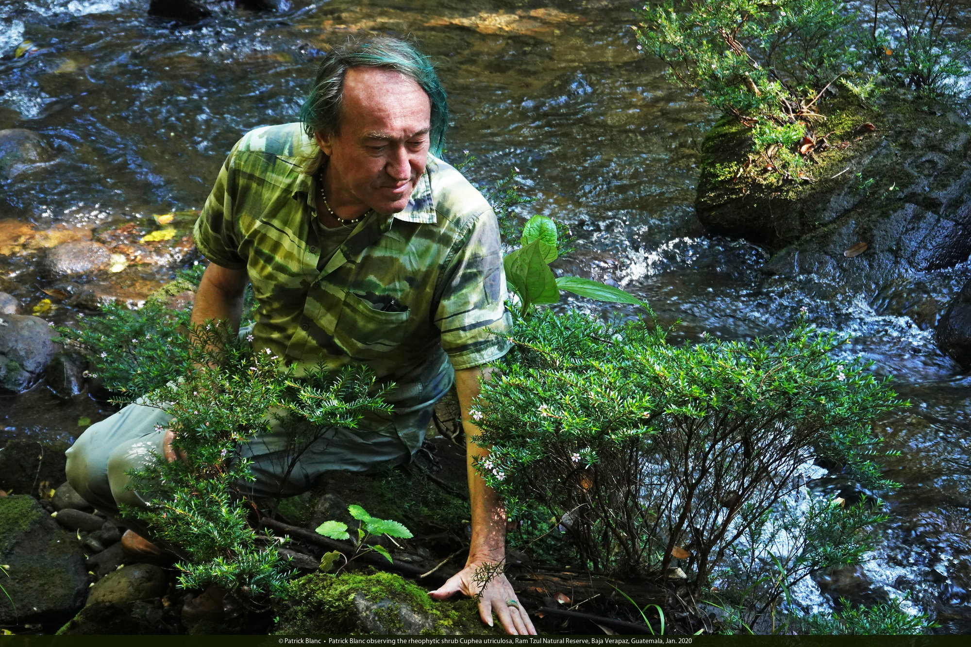 Patrick Blanc observing the small light purple flowers of the rheophytic shrub Cuphea utriculosa, Ram Tzul Natural Reserve, Baja Verapaz, Guatemala, Jan. 2020