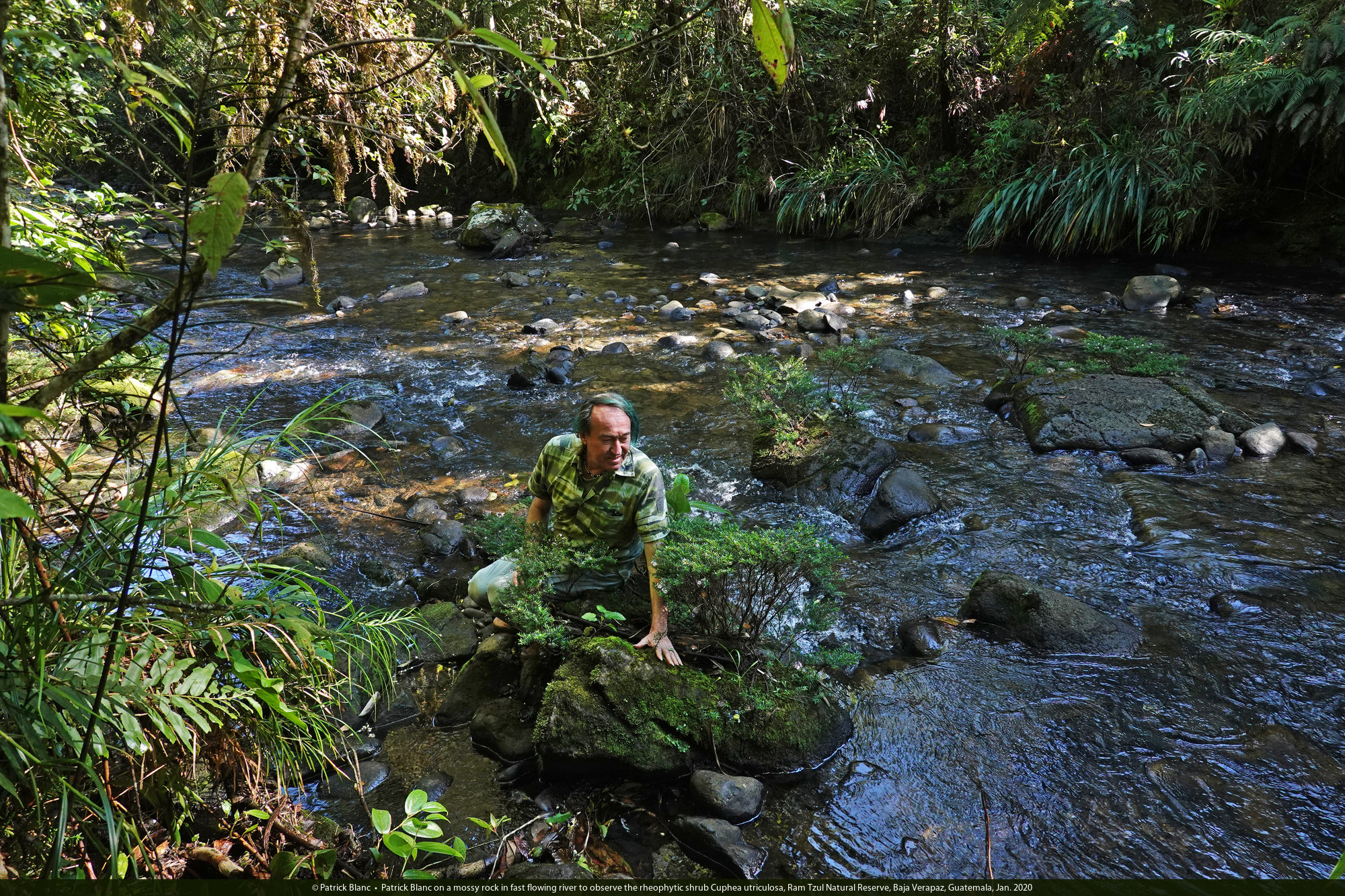Patrick Blanc on a mossy rock in fast flowing river to observe the rheophytic shrub Cuphea utriculosa, Ram Tzul Natural Reserve, Baja Verapaz, Guatemala, Jan. 2020