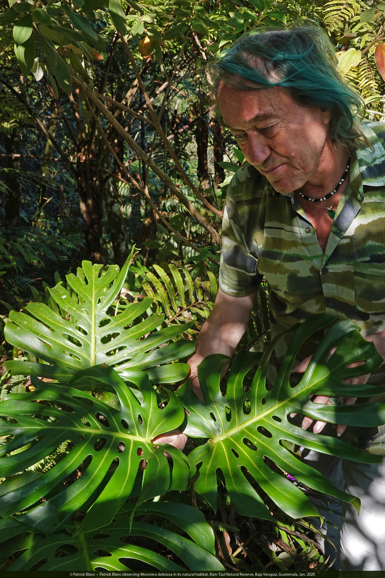 Patrick Blanc observing Monstera deliciosa in its natural habitat, Ram Tzul Natural Reserve, Baja Verapaz, Guatemala, Jan. 2020
