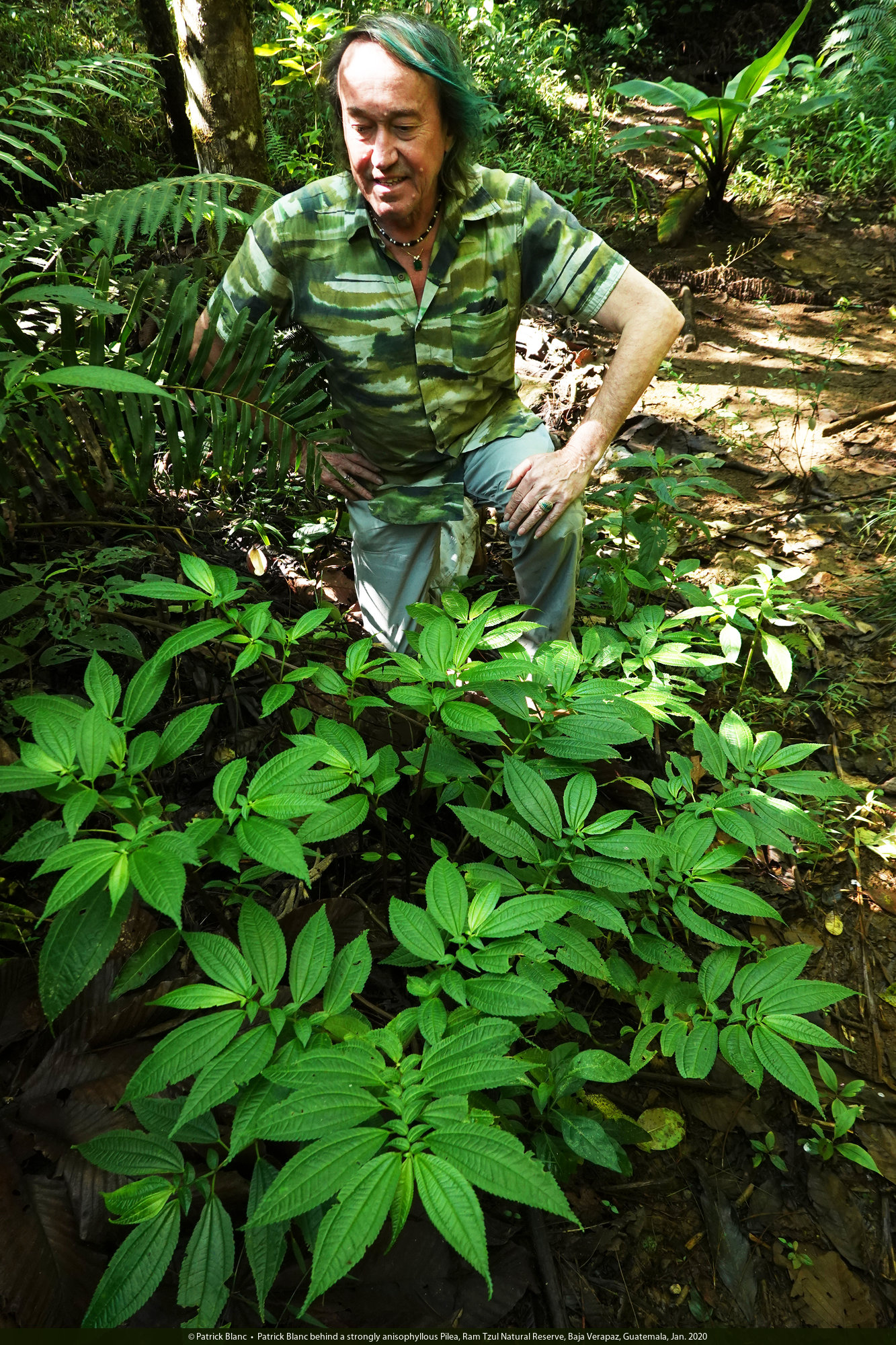 Patrick Blanc behind a strongly anisophyllous Pilea, Ram Tzul Natural Reserve, Baja Verapaz, Guatemala, Jan. 2020