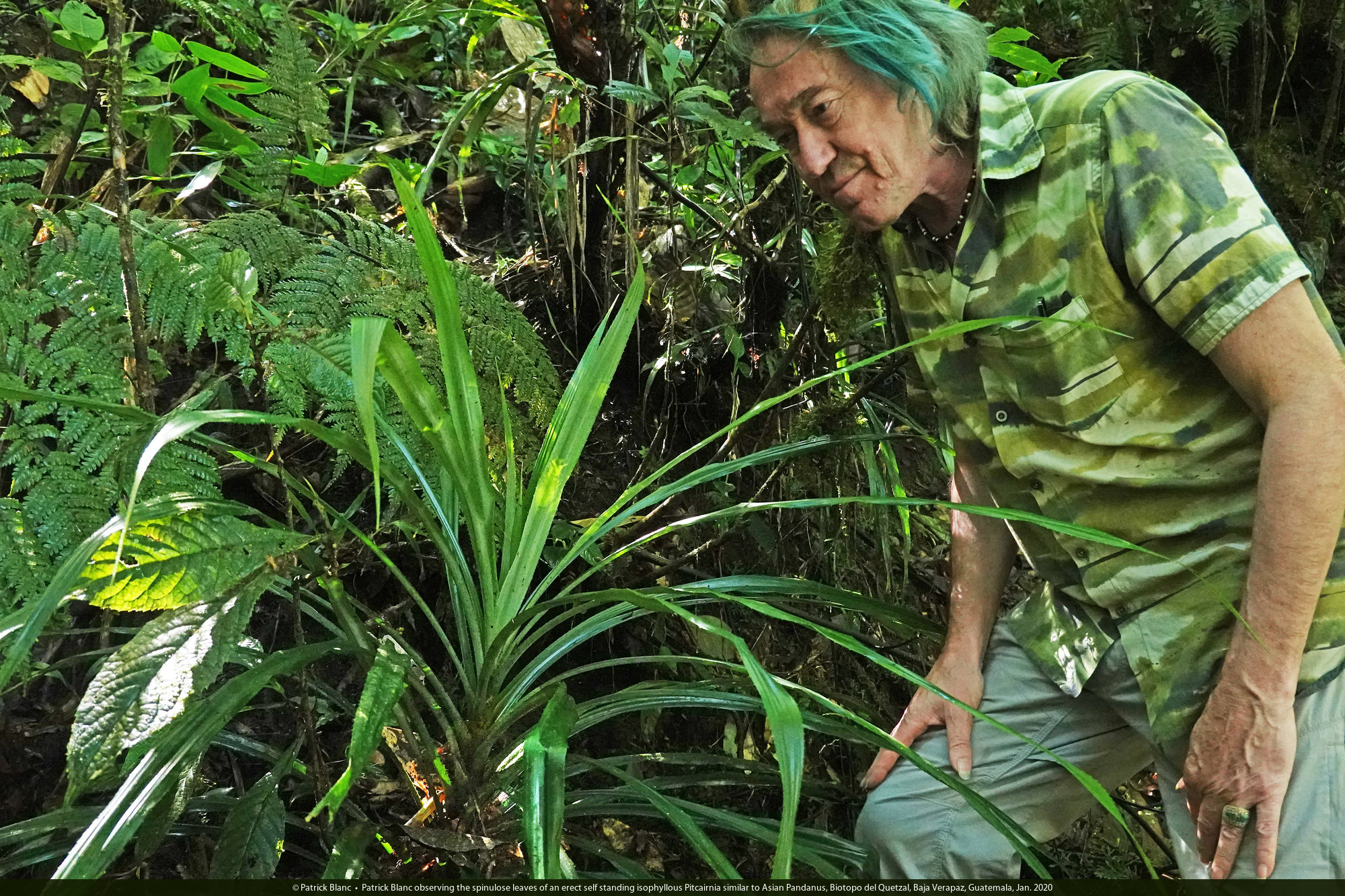 Patrick Blanc observing the spinulose leaves of an erect self standing isophyllous Pitcairnia similar to Asian Pandanus, Biotopo del Quetzal, Baja Verapaz, Guatemala, Jan. 2020