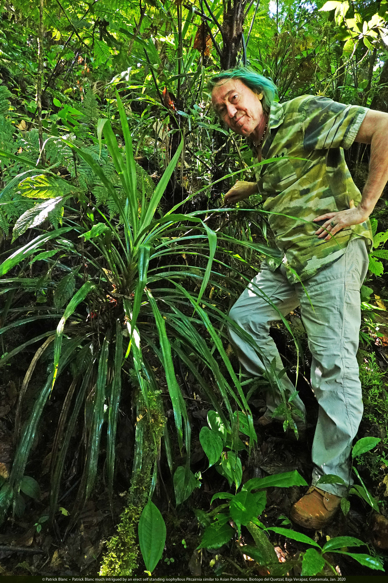 Patrick Blanc much intrigued by an erect self standing isophyllous Pitcairnia similar to Asian Pandanus, Biotopo del Quetzal, Baja Verapaz, Guatemala, Jan. 2020