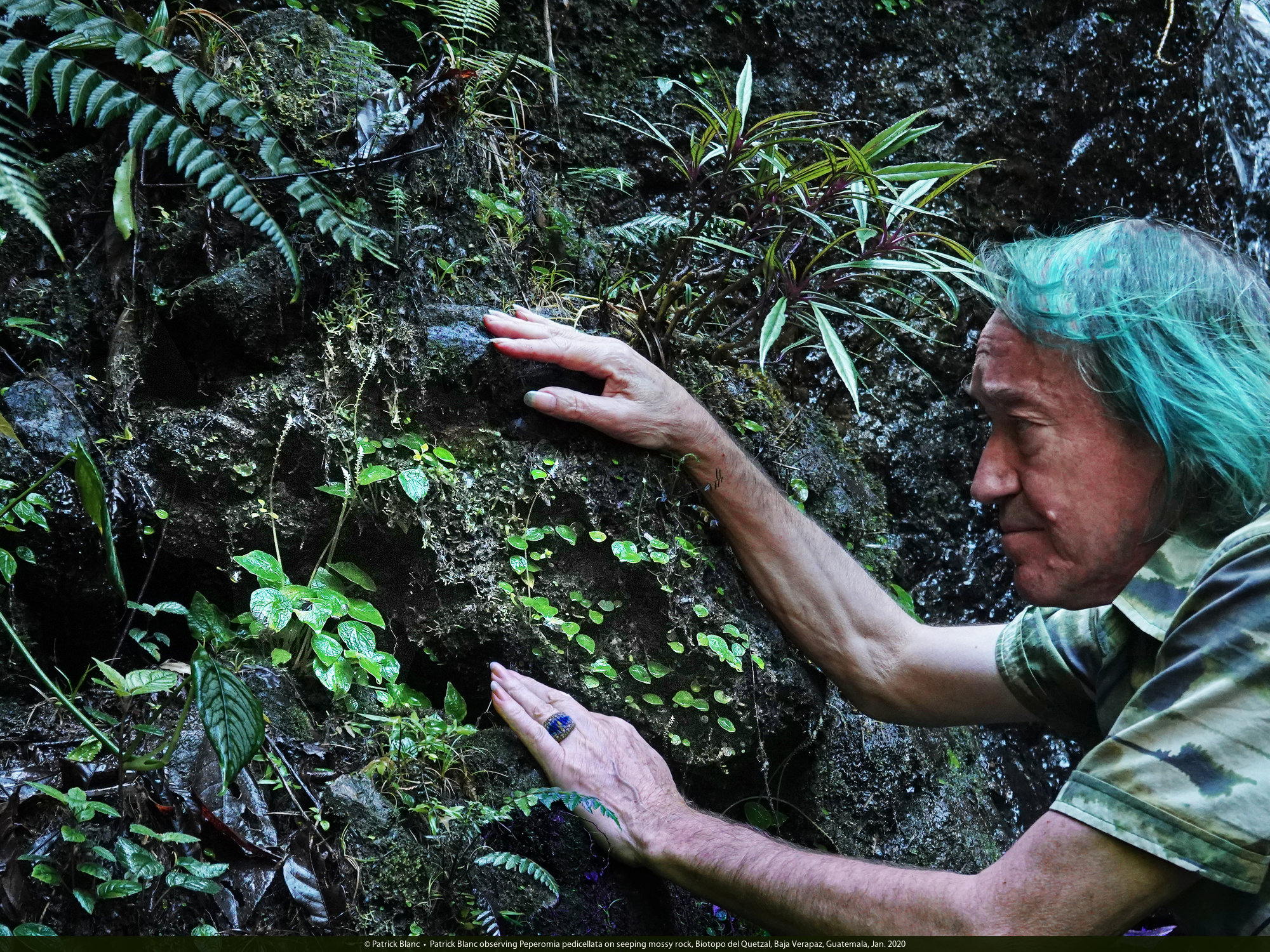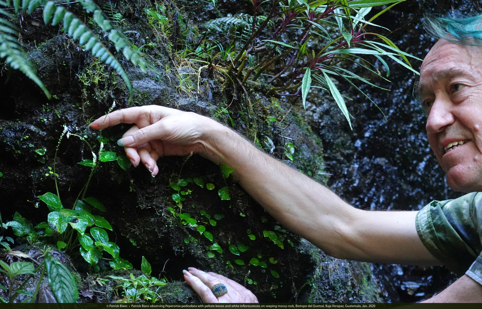 Patrick Blanc observing Peperomia pedicellata with peltate leaves and white inflorescences on seeping mossy rock, Biotopo del Quetzal, Baja Verapaz, Guatemala, Jan. 2020