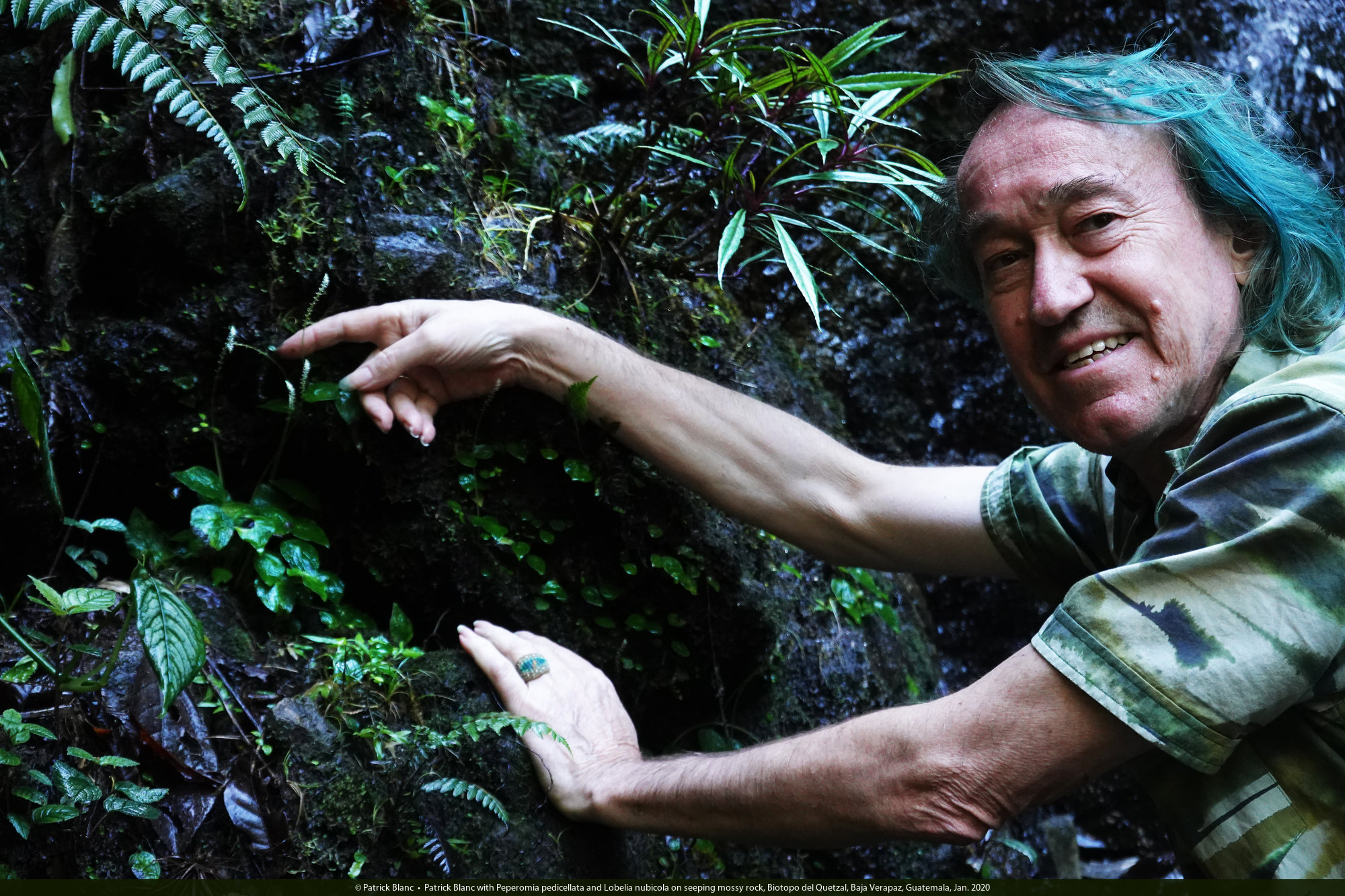 Patrick Blanc with Peperomia pedicellata and Lobelia nubicola on seeping mossy rock, Biotopo del Quetzal, Baja Verapaz, Guatemala, Jan. 2020