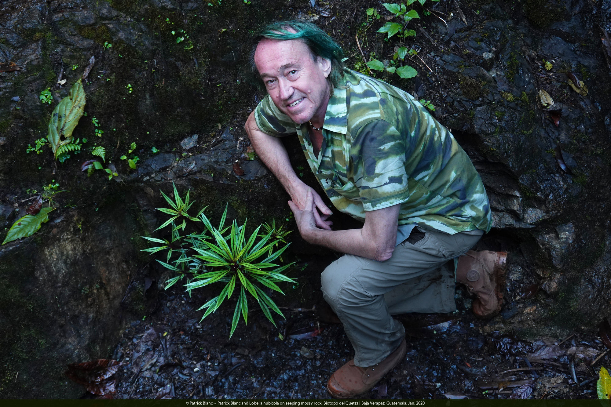Patrick Blanc and Lobelia nubicola on seeping mossy rock, Biotopo del Quetzal, Baja Verapaz, Guatemala, Jan. 2020
