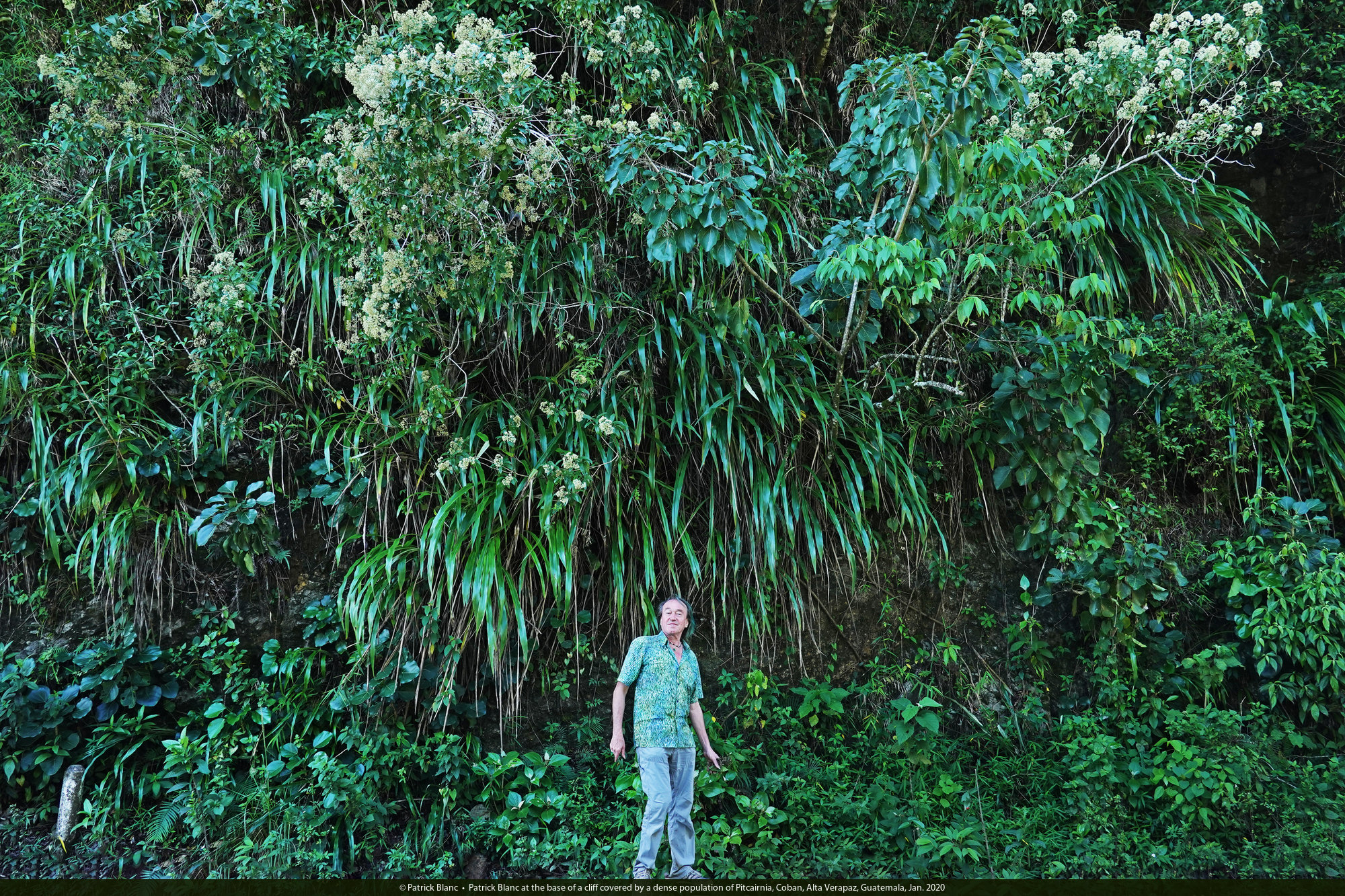 Patrick Blanc at the base of a cliff covered by a dense population of Pitcairnia, Coban, Alta Verapaz, Guatemala, Jan. 2020