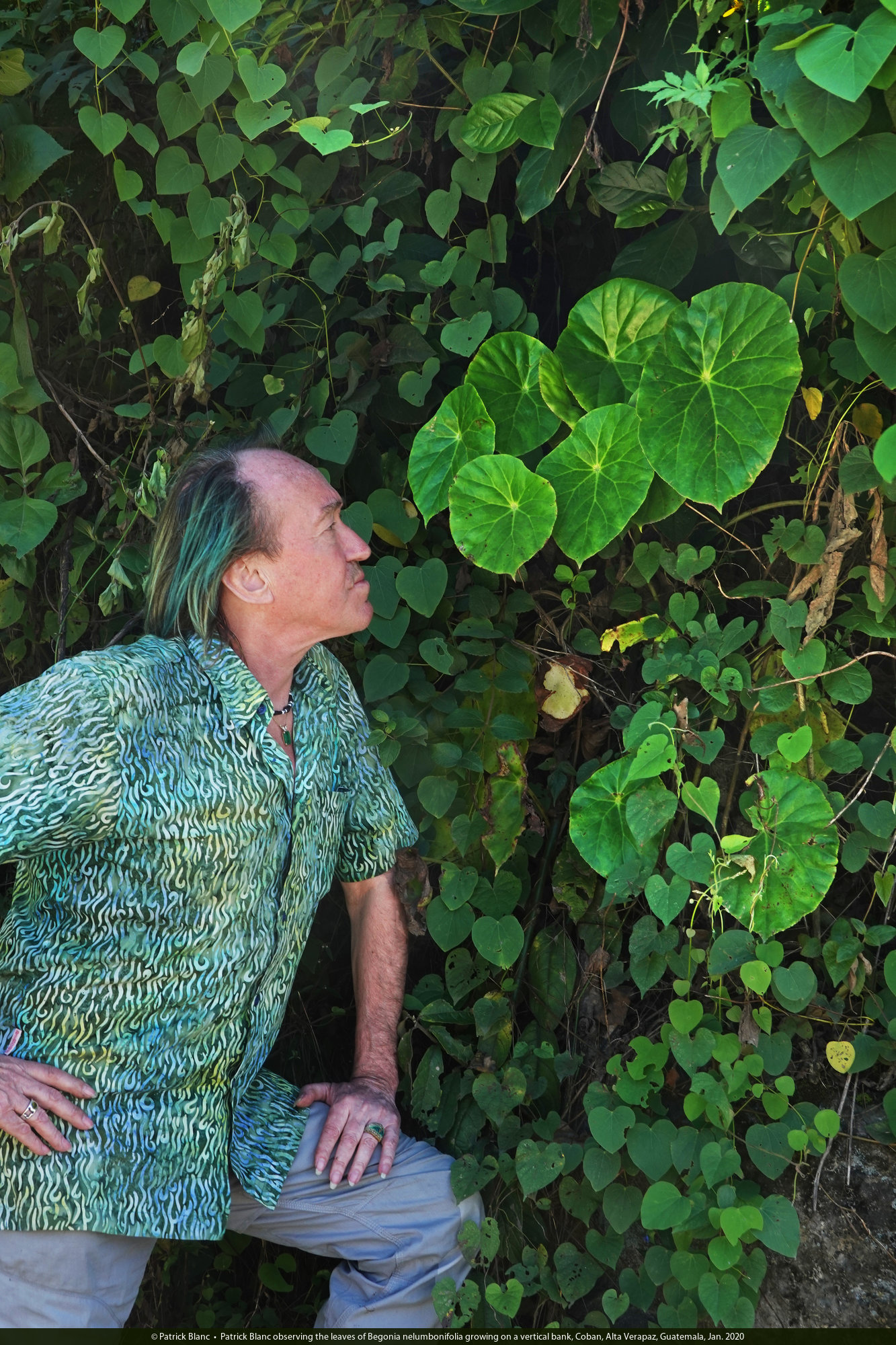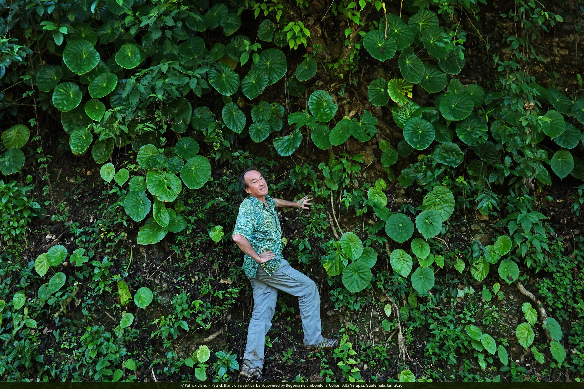 Patrick Blanc on a vertical bank covered by Begonia nelumbonifolia, Coban, Alta Verapaz, Guatemala, Jan. 2020