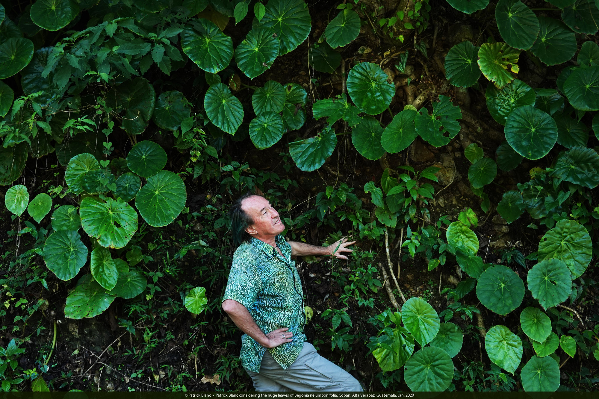 Patrick Blanc considering the huge leaves of Begonia nelumbonifolia, Coban, Alta Verapaz, Guatemala, Jan. 2020