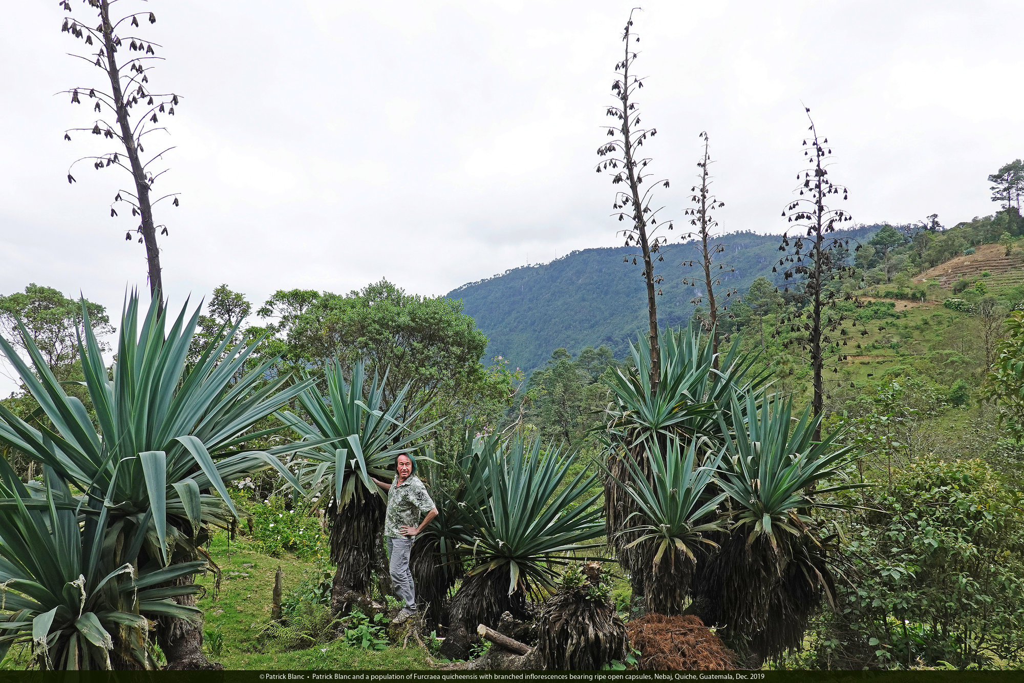 Patrick Blanc and a population of Furcraea quicheensis with branched inflorescences bearing ripe open capsules, Nebaj, Quiche, Guatemala, Dec. 2019