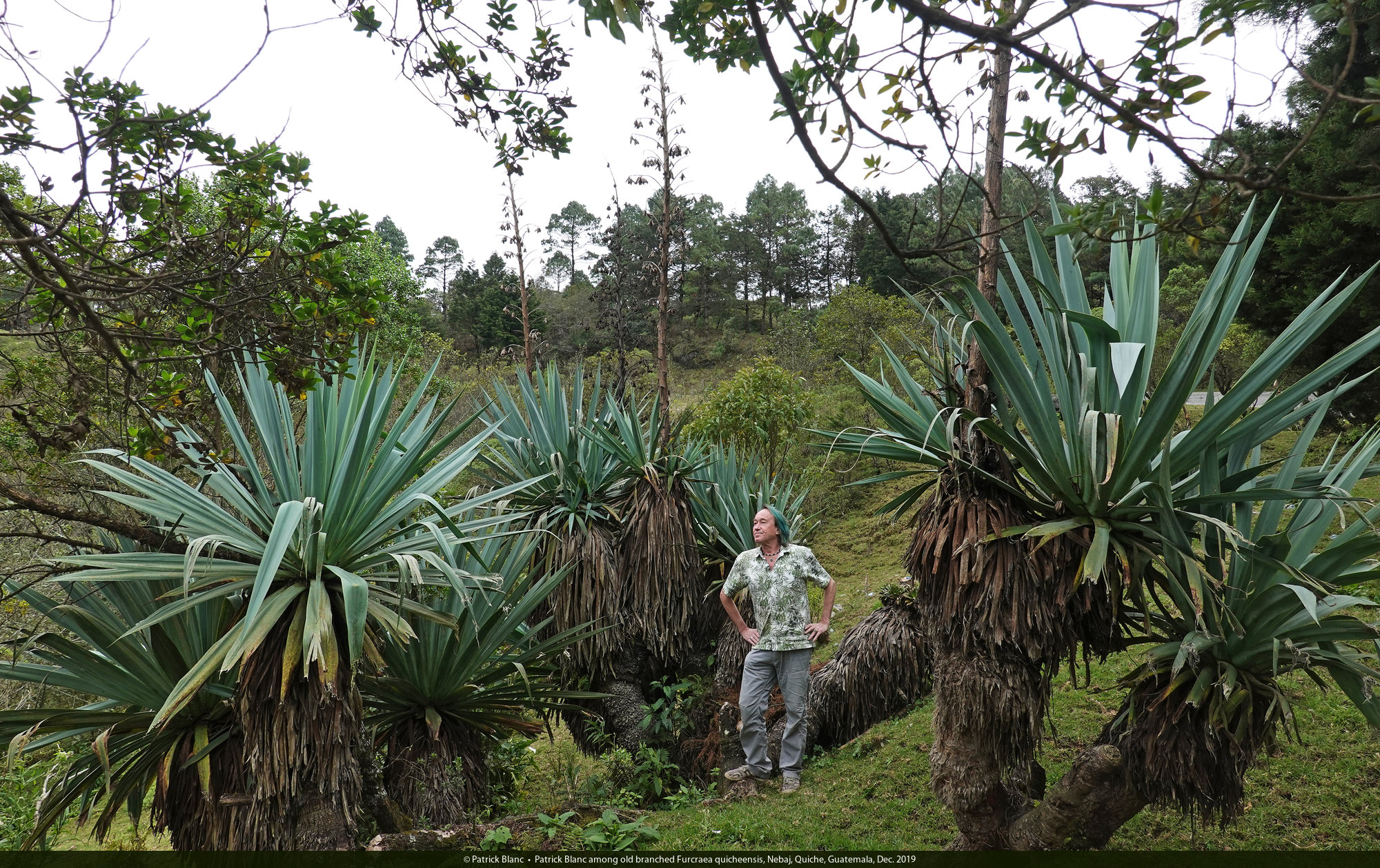 Patrick Blanc among old branched Furcraea quicheensis, Nebaj, Quiche, Guatemala, Dec. 2019