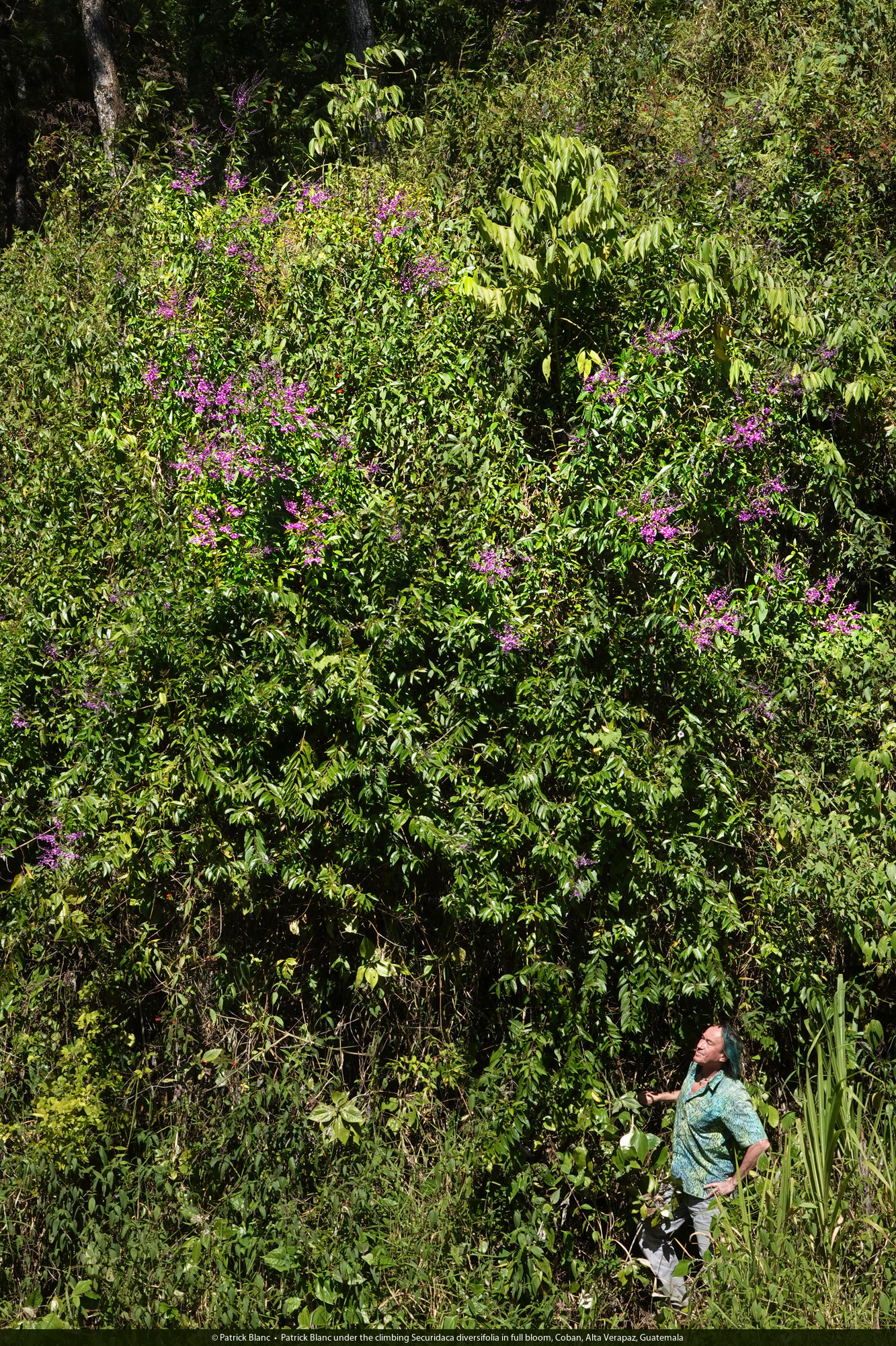 Patrick Blanc under the climbing Securidaca diversifolia in full bloom, Coban, Alta Verapaz, Guatemala