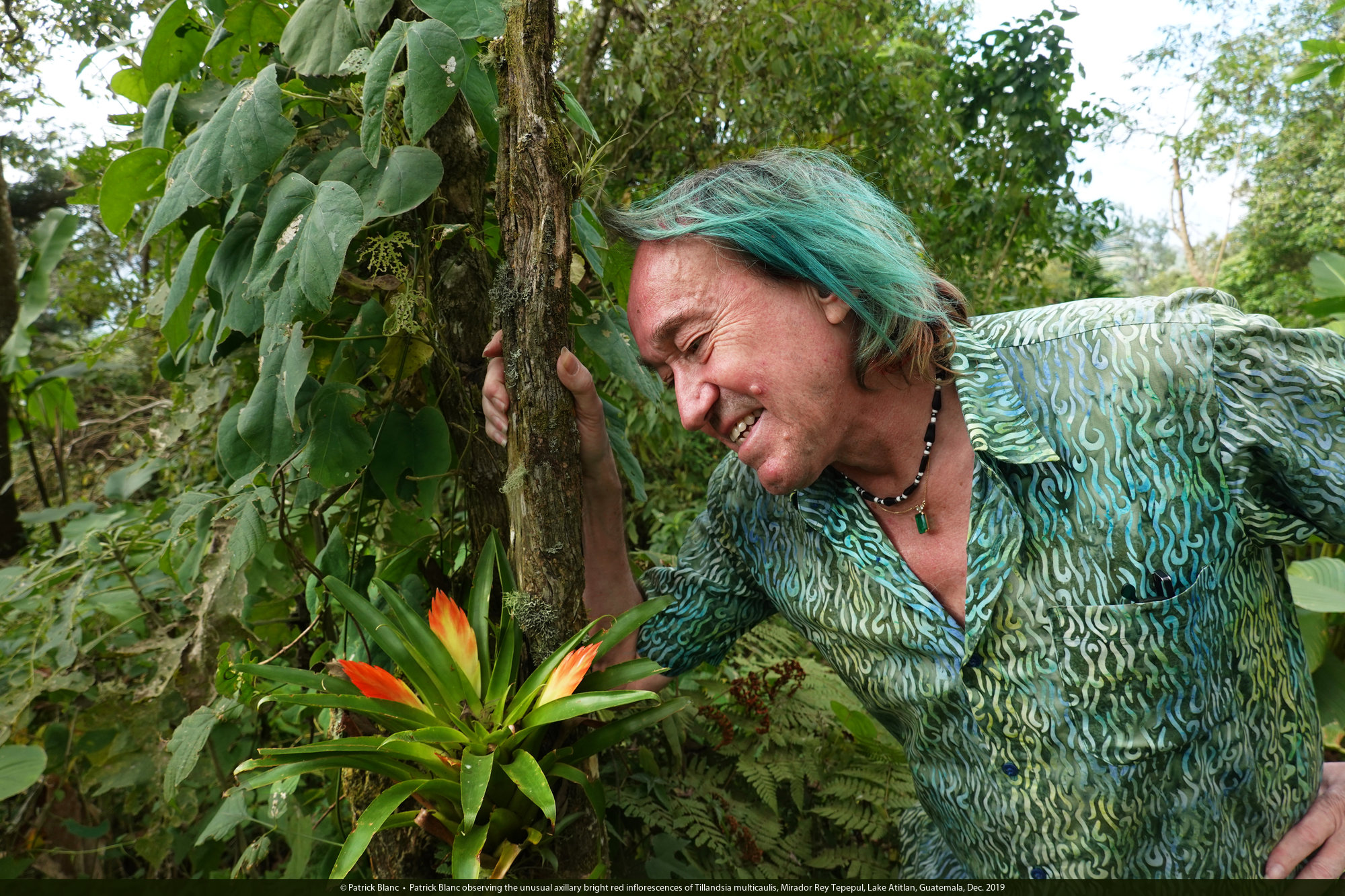 Patrick Blanc observing the unusual axillary bright red inflorescences of Tillandsia multicaulis, Mirador Rey Tepepul, Lake Atitlan, Guatemala, Dec. 2019