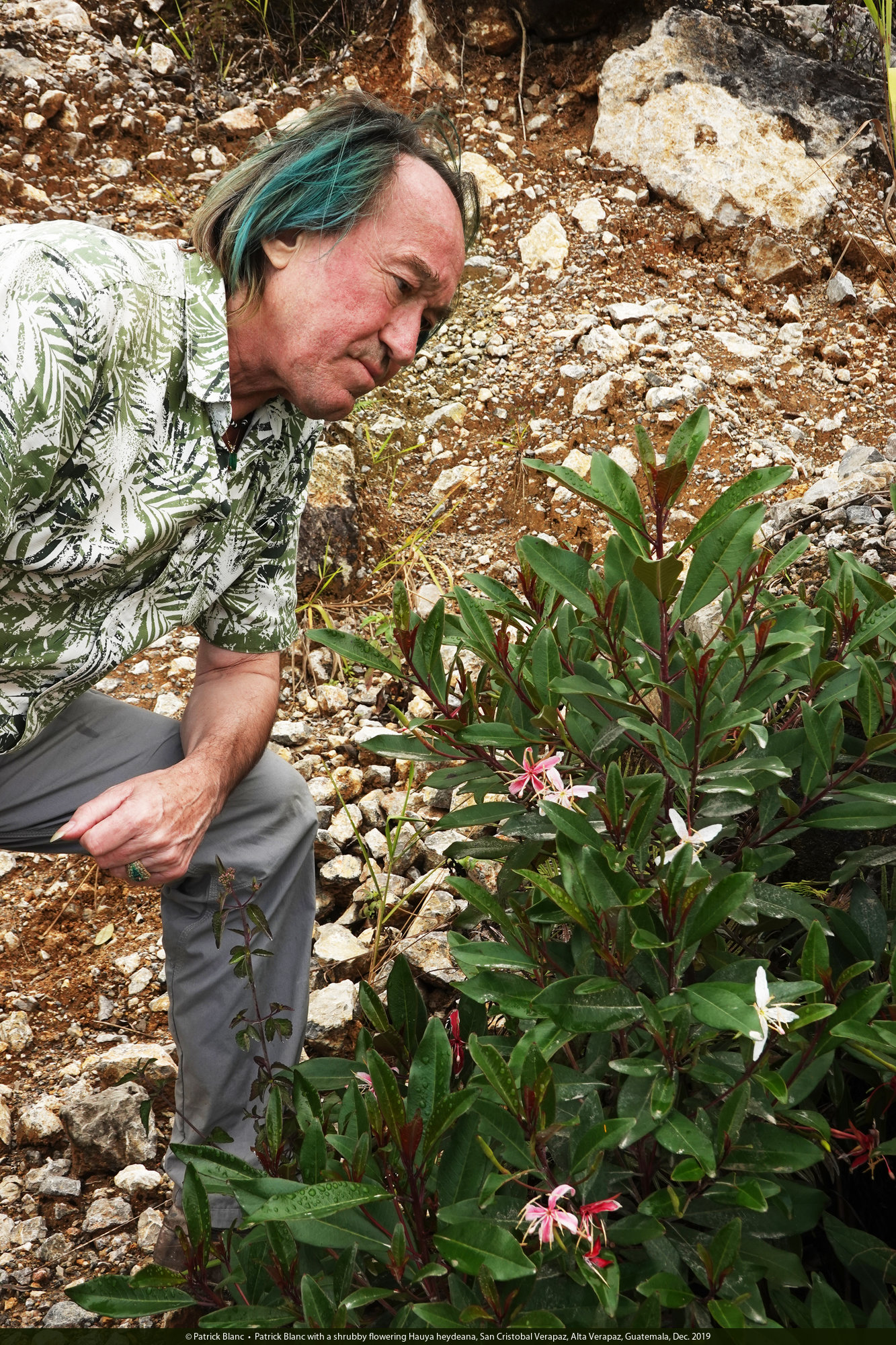 Patrick Blanc observing a shrubby flowering Hauya heydeana, San Cristobal Verapaz, Alta Verapaz, Guatemala, Dec. 2019