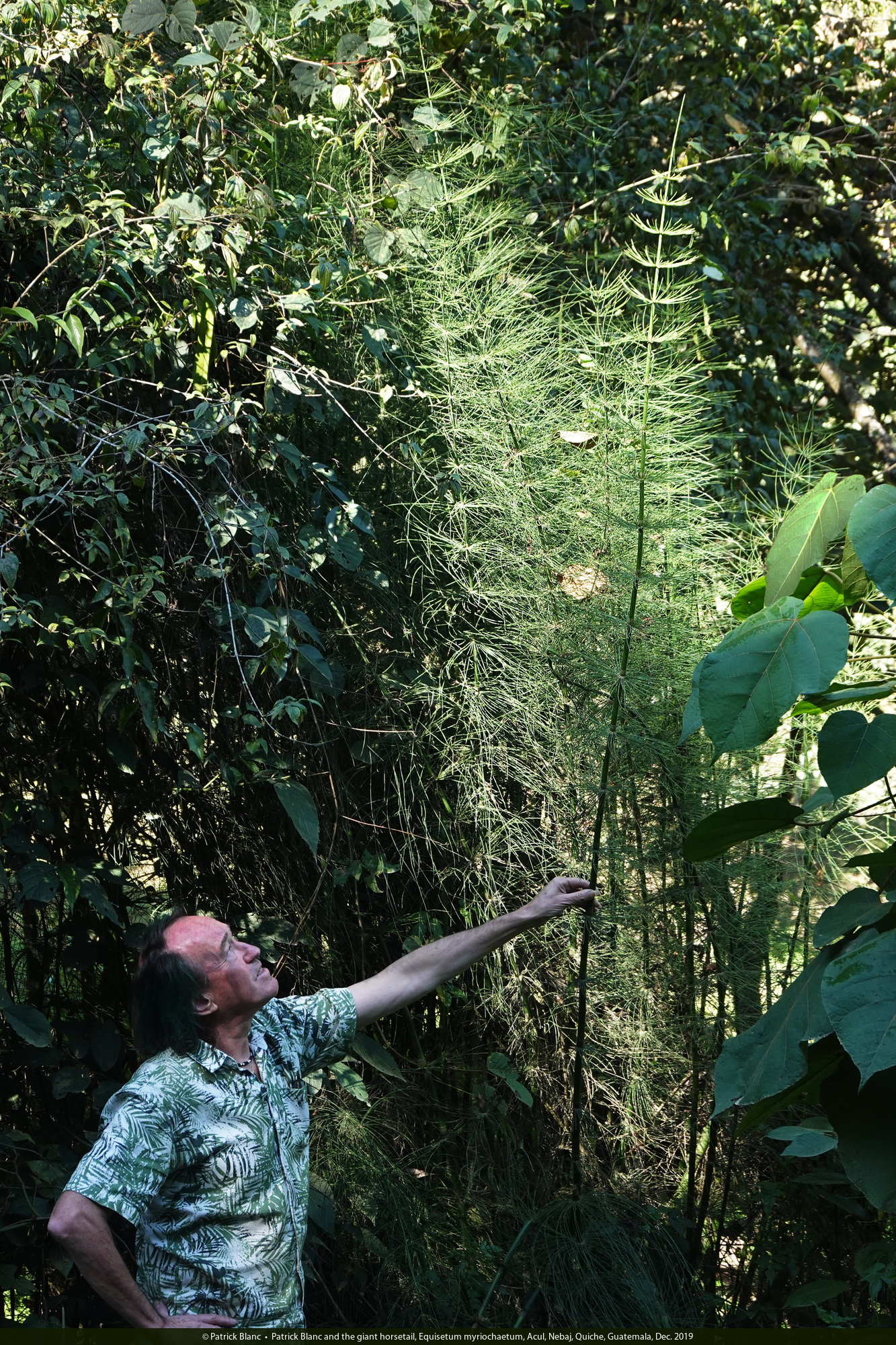 Patrick Blanc and the giant horsetail, Equisetum myriochaetum, Acul, Nebaj, Quiche, Guatemala, Dec. 2019
