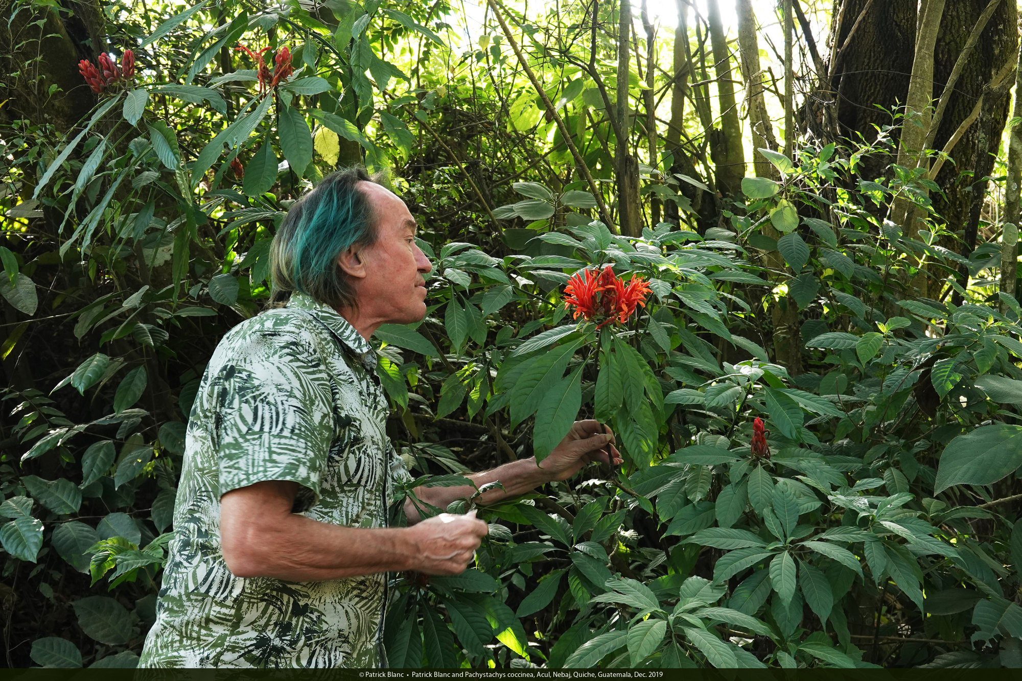 Patrick Blanc and Pachystachys coccinea, Acul, Nebaj, Quiche, Guatemala, Dec. 2019