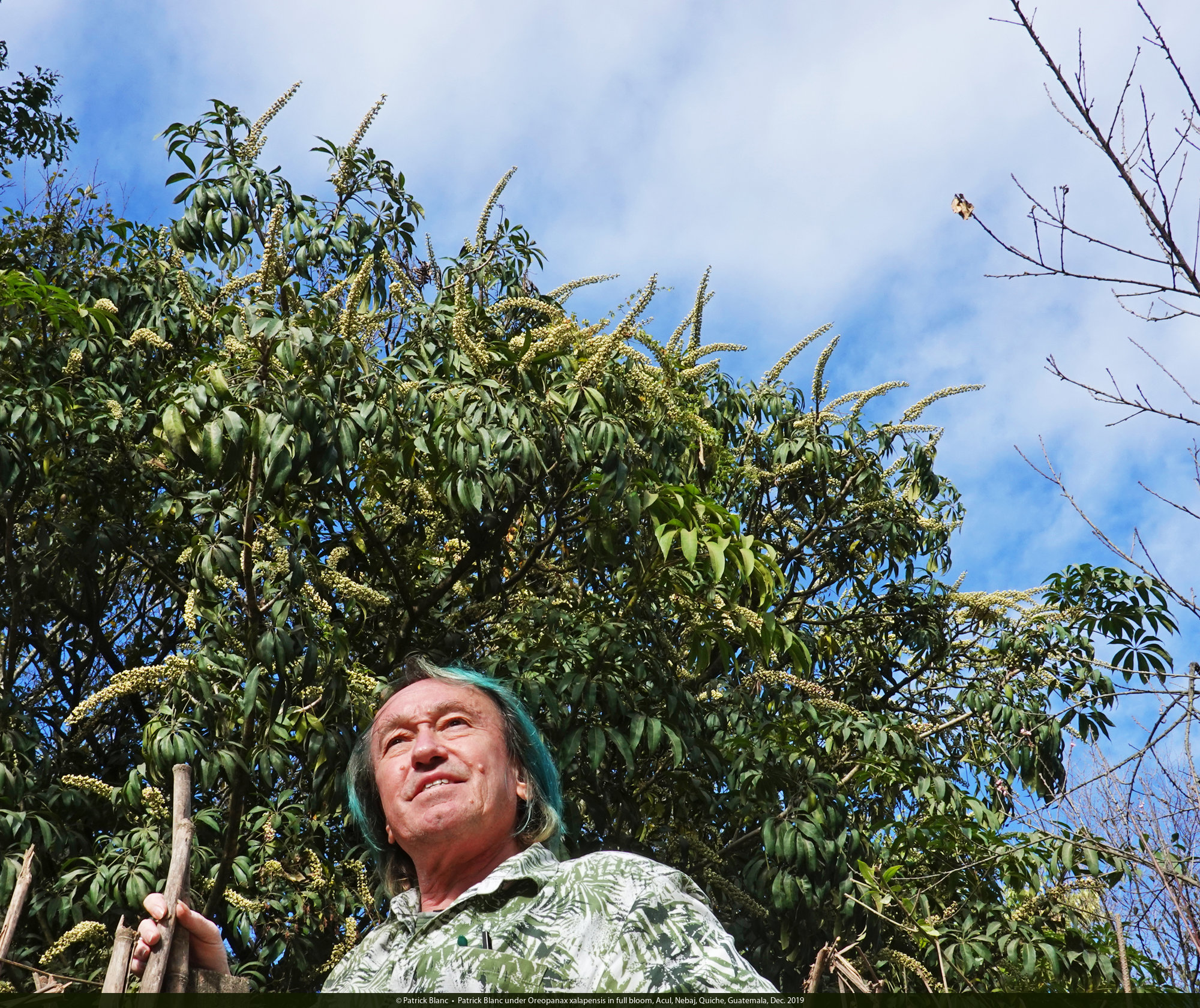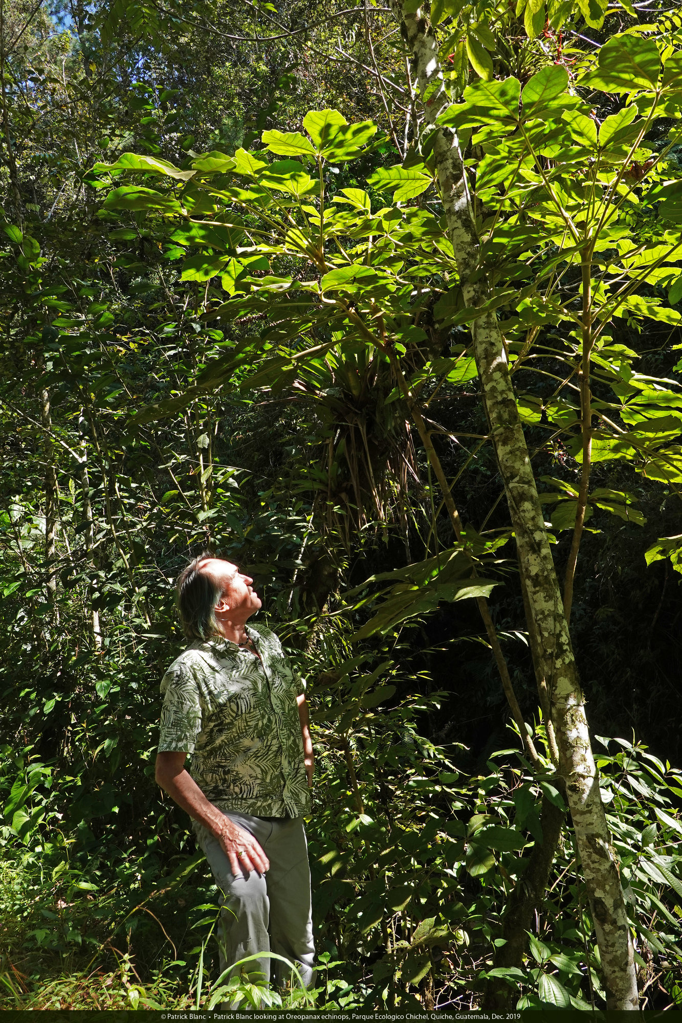 Patrick Blanc under Oreopanax xalapensis in full bloom, Acul, Nebaj, Quiche, Guatemala, Dec. 2019