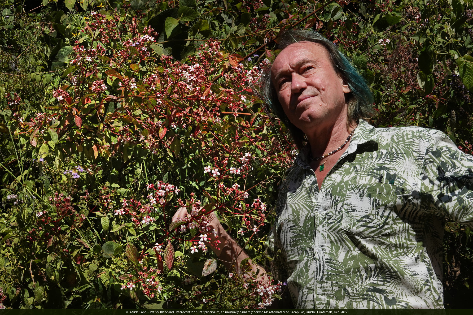 Patrick Blanc and Heterocentron subtriplinervium, an unusually pinnately nerved Melastomataceae, Sacapulas, Quiche, Guatemala, Dec. 2019