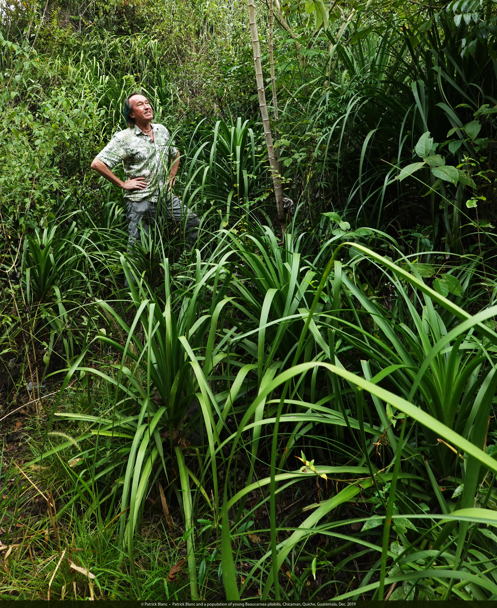 Patrick Blanc among young Beaucarnea pliabilis, Chicaman, Quiche, Guatemala, Dec. 2019