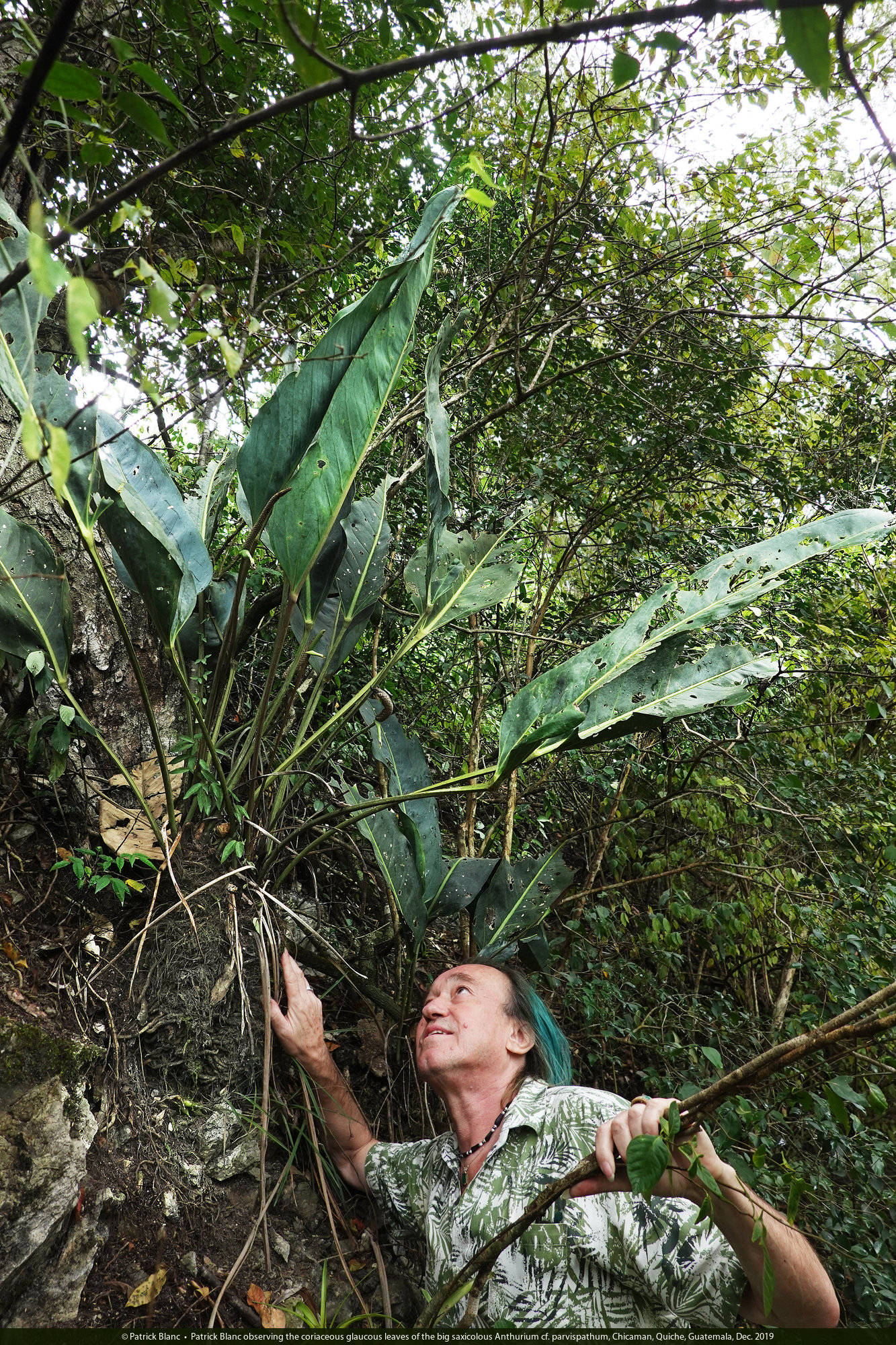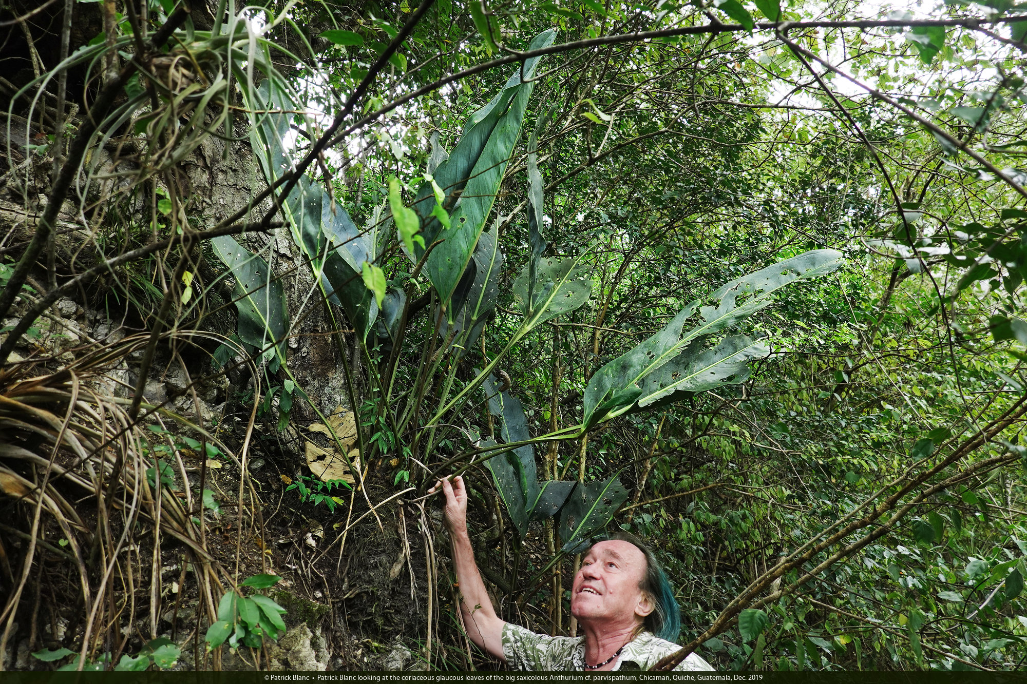 Patrick Blanc observing the coriaceous glaucous leaves of the big saxicolous Anthurium cf. parvispathum, Chicaman, Quiche, Guatemala, Dec. 2019