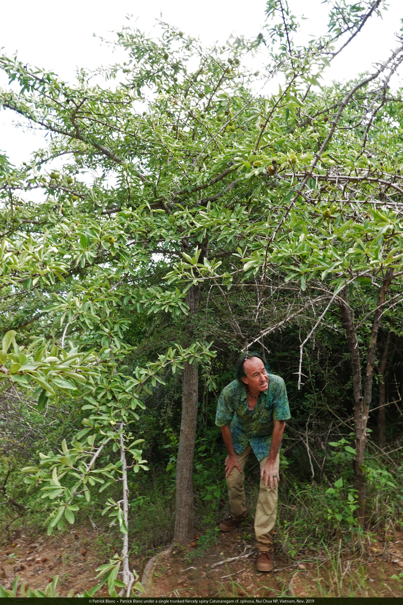 Patrick Blanc under a single trunked fiercely spiny Catunaregam cf. spinosa, Nui Chua NP, Vietnam, Nov. 2019