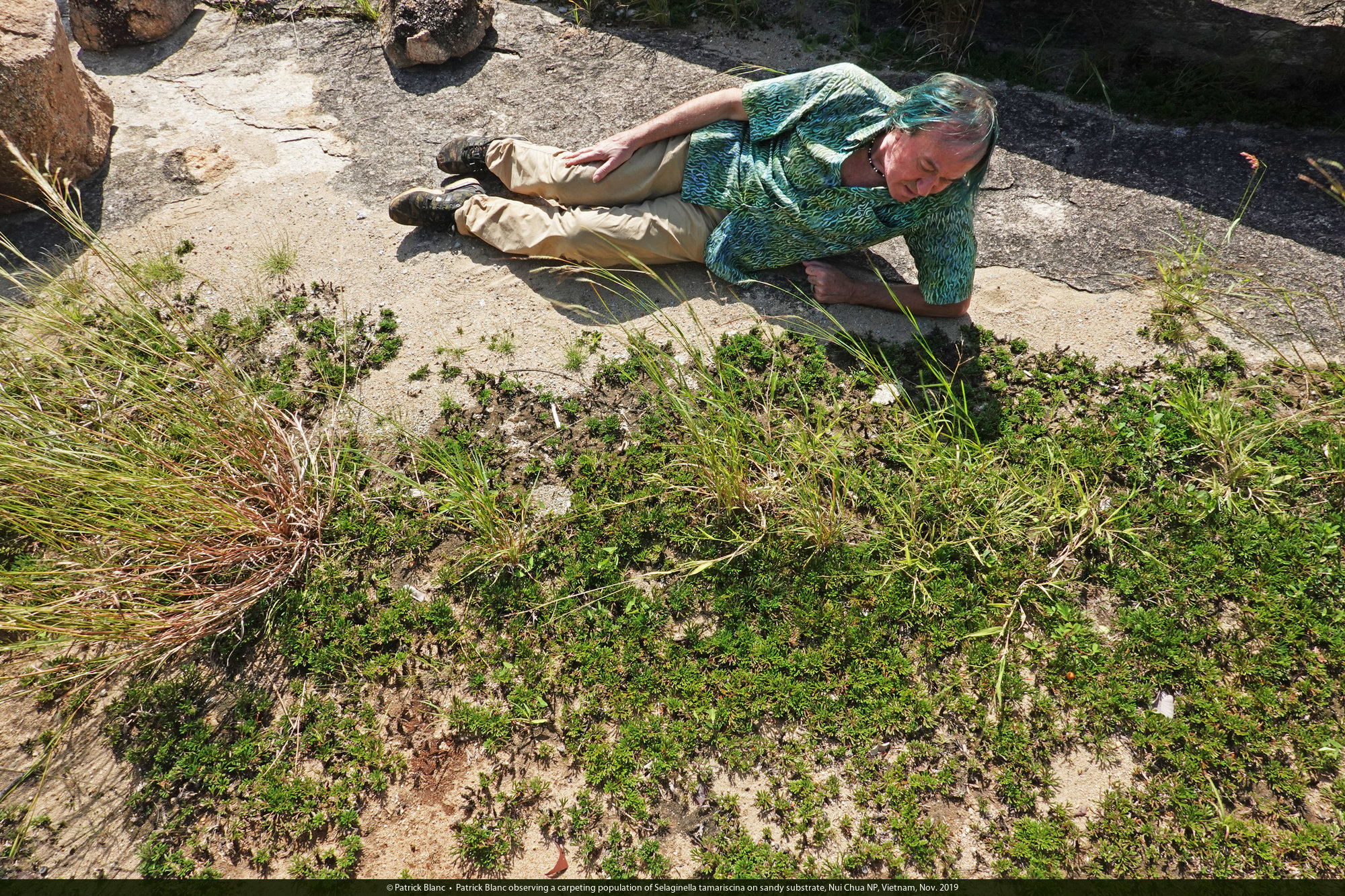 Patrick Blanc observing a dense population of Selaginella tamariscina on exposed oblique rock slab, Nui Chua NP, Vietnam, Nov. 2019