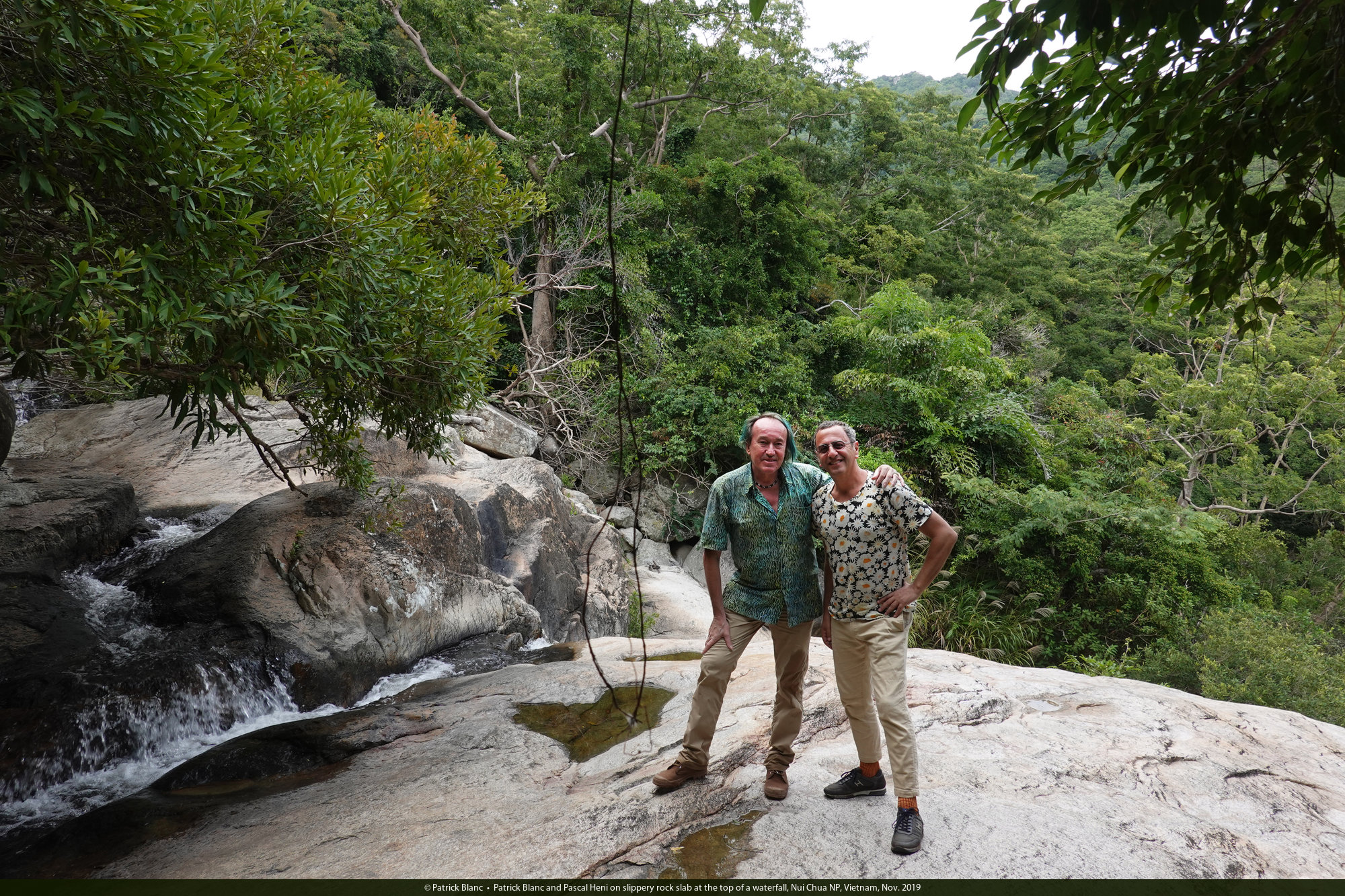 Patrick Blanc and Pascal Heni on slippery rock slab at the top of a waterfall, Nui Chua NP, Vietnam, Nov. 2019