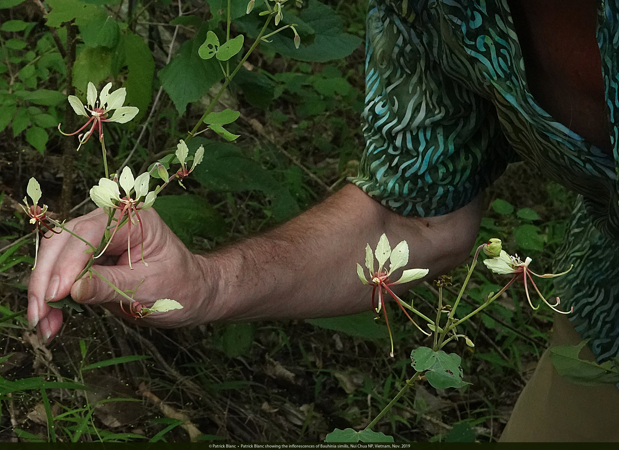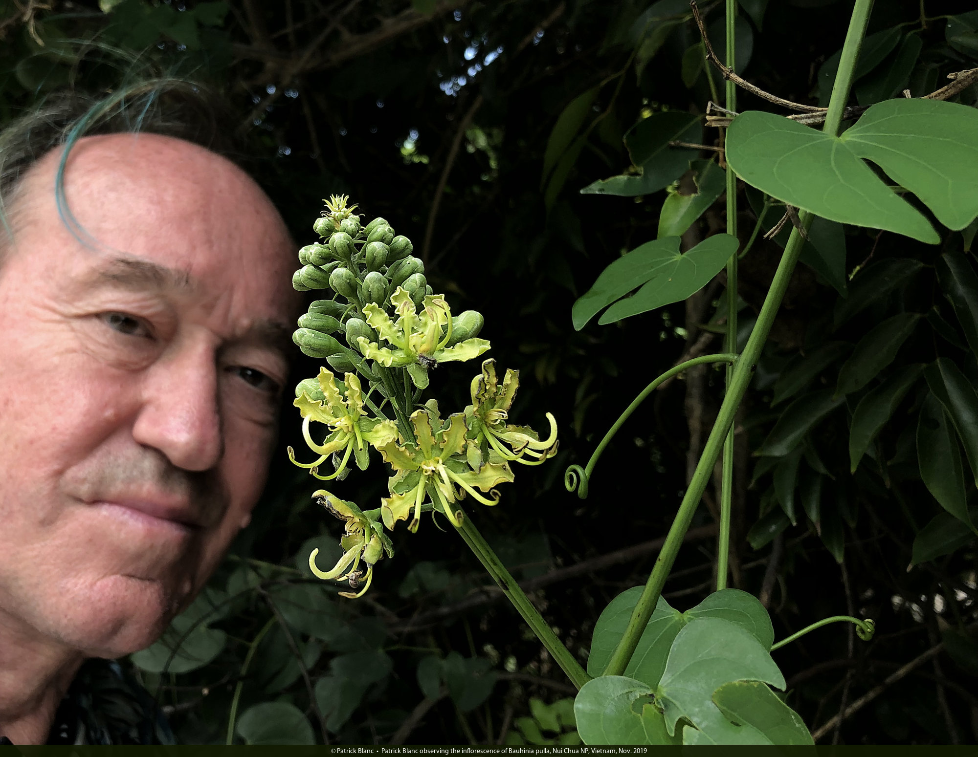 Patrick Blanc showing the inflorescences of Bauhinia similis, Nui Chua NP, Vietnam, Nov. 2019