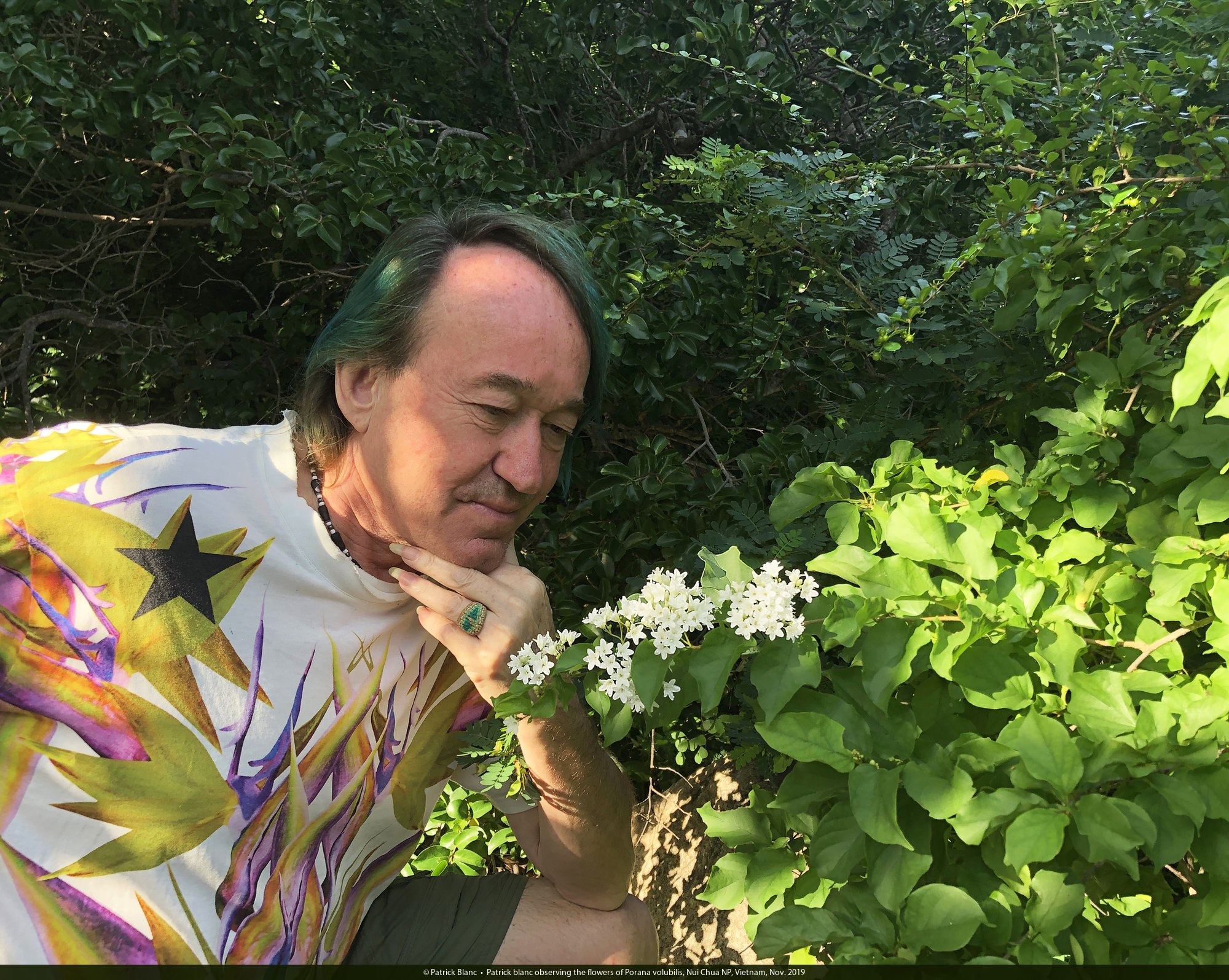 Patrick blanc observing the flowers of Porana volubilis, Nui Chua NP, Vietnam, Nov. 2019