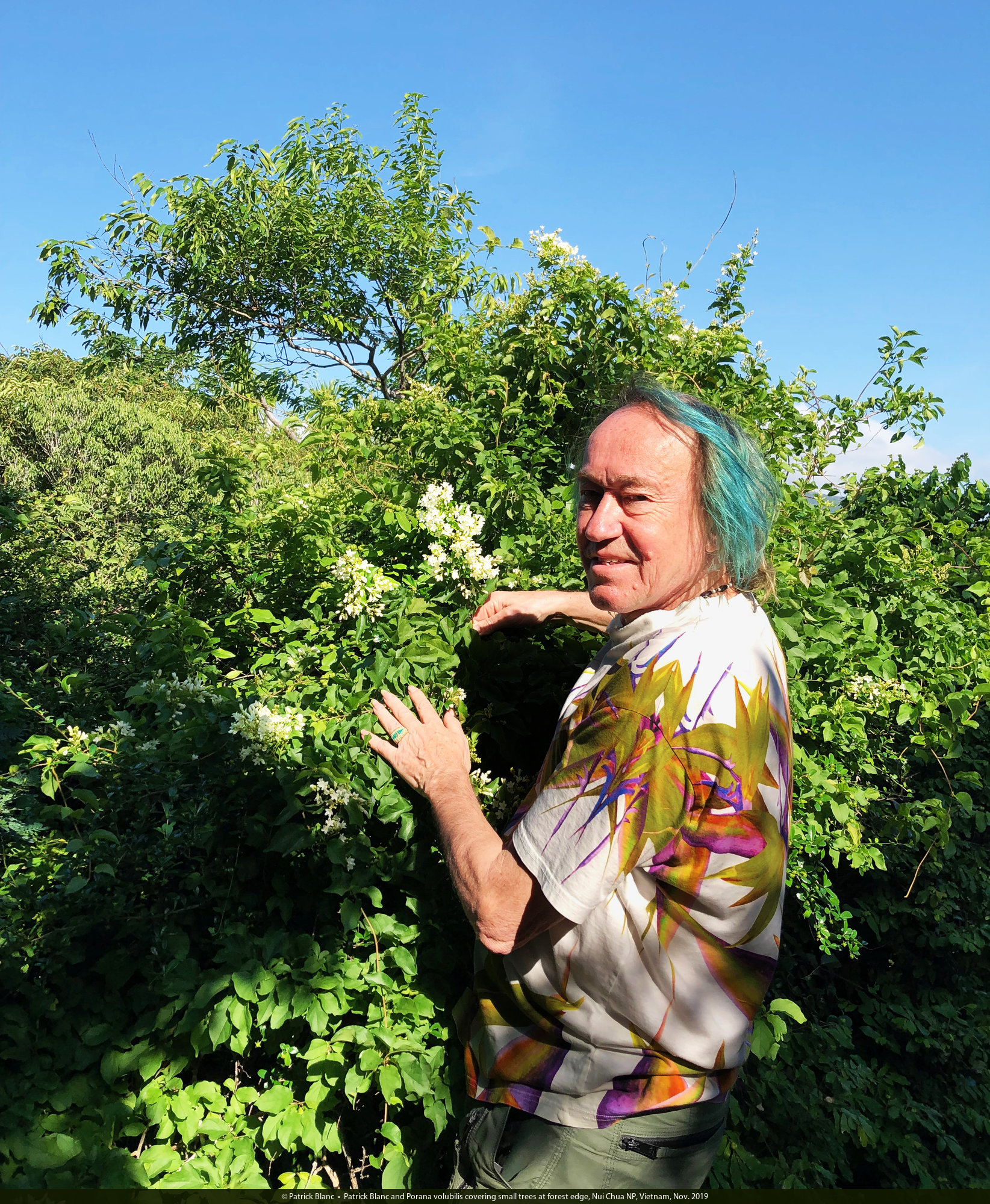 Patrick Blanc and Porana volubilis covering small trees at forest edge, Nui Chua NP, Vietnam, Nov. 2019